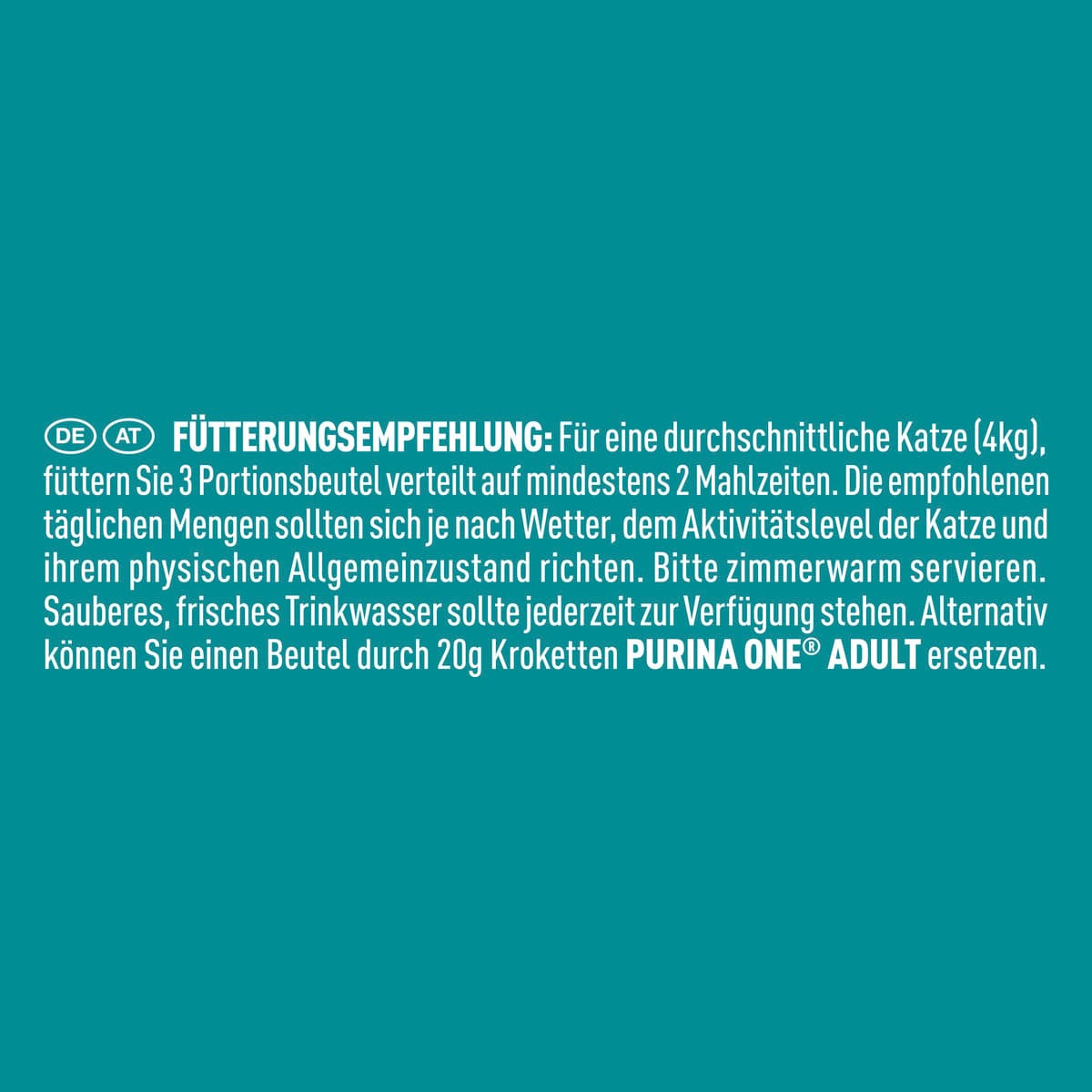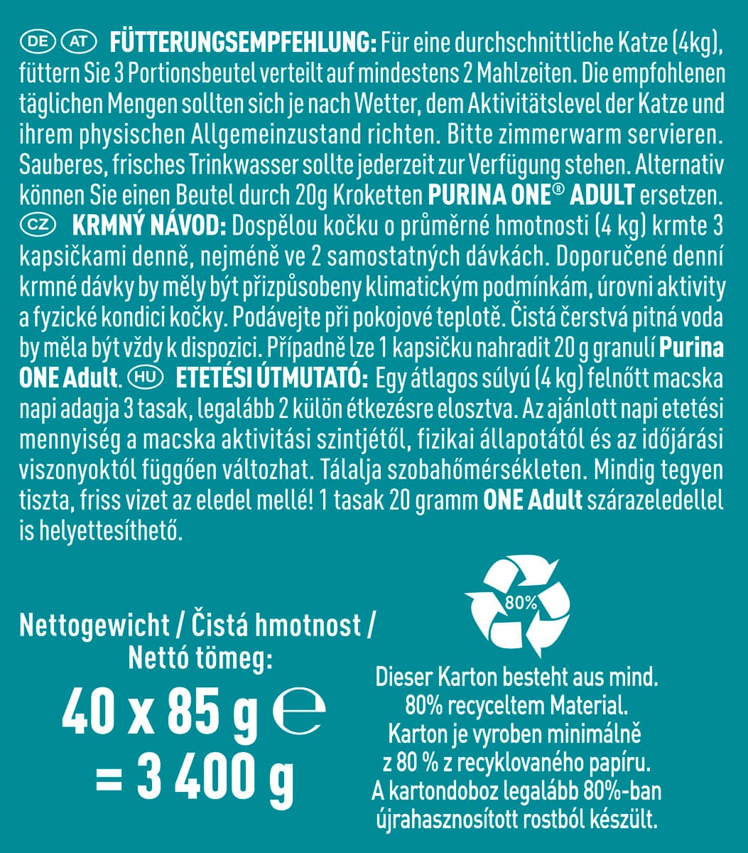 FütterungsempfehlungFür eine durchschnittliche Katze (4kg), füttern Sie 3 bis 4 Portionsbeutel verteilt auf mindestens 2 Mahlzeiten. Die empfohlenen täglichen Mengen sollten sich je nach Wetter, dem Aktivitätslevel der Katze und ihrem physischen Allgemeinzustand richten. Bitte zimmerwarm servieren. Sauberes, frisches Trinkwasser sollte jederzeit zur Verfügung stehen.