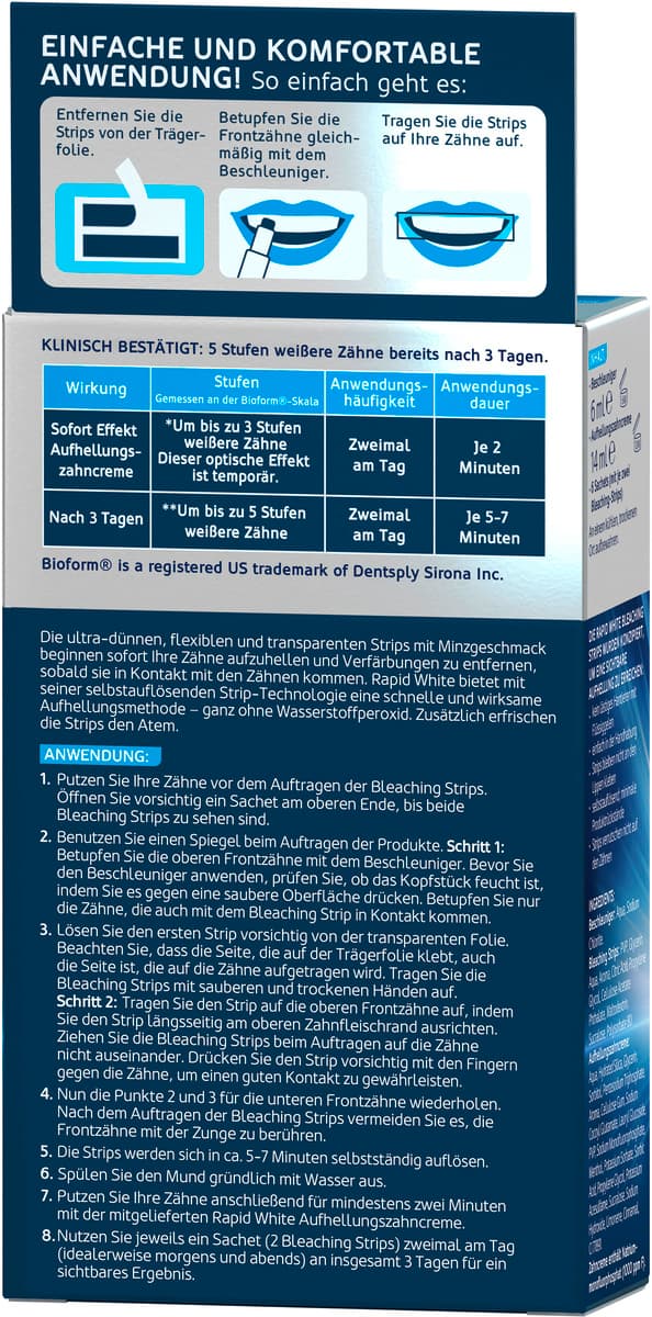 - DIE RAPID WHITE BLEACHING STRIPS WURDEN KONZIPIERT, UM EINE SICHTBAREAUFHELLUNG ZU ERREICHEN:• kein lästiges Hantieren mit Flüssiggelen• einfach in der Handhabung• Strips bleiben nicht an den Lippen kleben• selbstauflösend; minimale Produkt