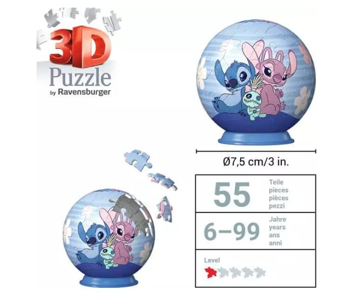 Stitch Fans aufgepasst! Der beliebte Disneys Stitch sowie seine Freunde gibt es jetzt als Ravensburger 3D Puzzle-Ball. Damit kannst du dir deinen süßen Disneyhelden selbst puzzeln und direkt nach Hause holen.Aus gewölbten Kunststoff-Puzzleteilen, die dank EasyClick Technology perfekt zusammen passen, entsteht Stück für Stück dieser stabile 3D Puzzle-Ball, ganz ohne Kleben. Die Nummerierung der Teile auf der Rückseite erleichtert das Vorsortieren und ermöglicht einfaches Puzzeln nach Zahlen.54 nummerierte Kunststoff-Puzzleteile + Aufsteller + AnleitungPuzzeln in der dritten Dimension! Die perfekte Geschenkidee für alle Stitch Fans ab 6 Jahren. Hochwertige Kunststoffteile mit Easyclick Technology für passgenauen Zusammenhalt - stabil, ganz ohne KlebstoffAus 54 hochwertigen Kunststoff-Puzzleteilen und Zubehörteilen entsteht Stück für Stück ein Puzzle-Ball - ein echter Hingucker und die perfekte Deko auf jedem SchreibtischIdeale Beschäftigung mit Gelinggarantie - dank bebilderter, farbiger Anleitung und nummerierten Puzzleteilen. Fördert räumliches Denkvermögen und FeinmotorikOb für Jungs oder Mädchen, Kinder oder Erwachsene - 3D Puzzlespaß für alle Stitch-Fans ab 6 JahrenSchwierigkeitsgrad 1/5, Durchmesser des fertigen Balles ca. 7,5 cm