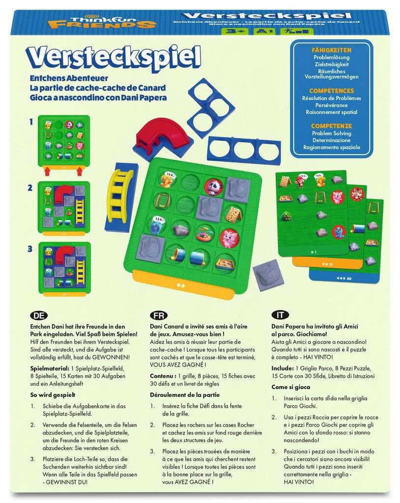 Mit Thinkfun Friends: Versteckspiel entdecken Kinder spielerisch die Welt des logischen Denkens. Gemeinsam mit Dani Duck und ihren Freunden lösen sie altersgerechte Herausforderungen, die das räumliche Vorstellungsvermögen und die Problemlösungsfähigkeit fördern.