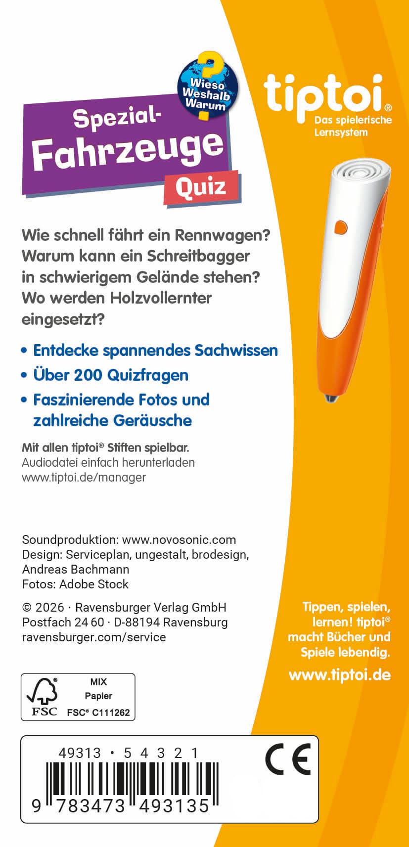 Warum kann ein Schreitbagger auch in schwierigem Gelände sicher stehen? Wie schnell kann ein Formel-1-Rennwagen fahren? Wo werden Holzvollernter eingesetzt? Dieses tiptoi Quiz beantwortet spannende Kinderfragen auf Augenhöhe und vermittelt so spielerisch Sachwissen zum Thema Spezialfahrzeuge. Über 200 Quizfragen, tolle Fotos und zahlreiche Geräusche motivieren Kinder ab 4 Jahren zum selbstständigen Entdecken und garantieren ein abwechslungsreiches Spiel.