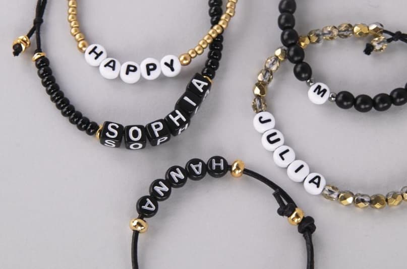 Buchstabenperlen-Allerlei. Die kleinen Perlenwürfel mit Buchstabendekor und Fädelloch eignen sich toll für Schnullerketten, Armbänder, Namensketten, Schlüsselanhänger und vieles mehr.