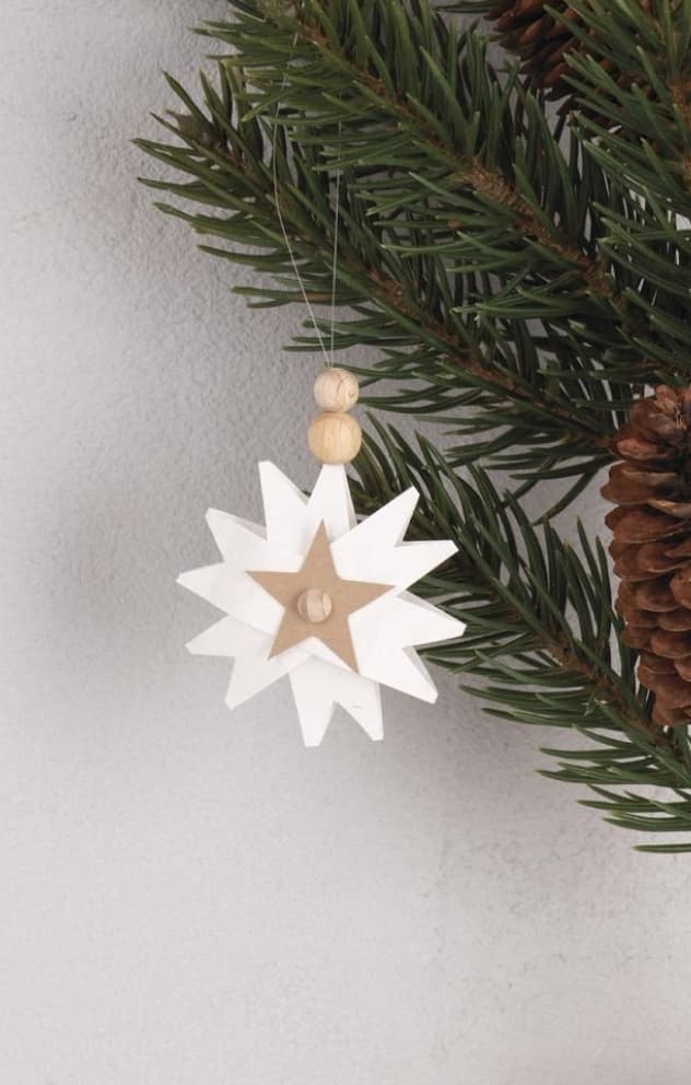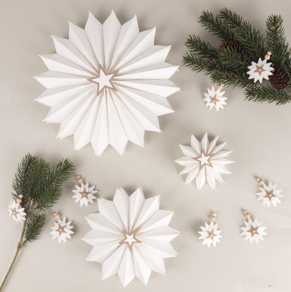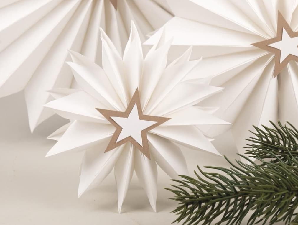 Zauberhafte 3D-Sterne aus weißen Papier-Tüten, in 4 Größen, mit natur-/weißfarbenen Papiersternen und Rohholzkugeln veredelt. Perfekt als Geschenkanhänger, Fensterschmuck oder für den Christbaum.So einfach entstehen die hübschen Papiersternchen: Die Tüten werden nach Anleitung gefaltet, geschnitten, geklebt und mit P Sternchen und Halbkugeln verziert. Der Perlonfaden dient als Aufhänger, die Holzperlen werden dekorativ aufgefädelt.