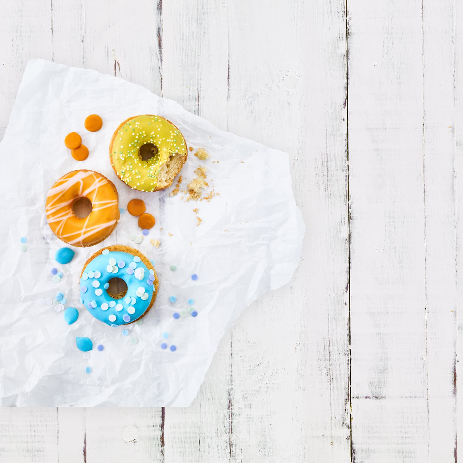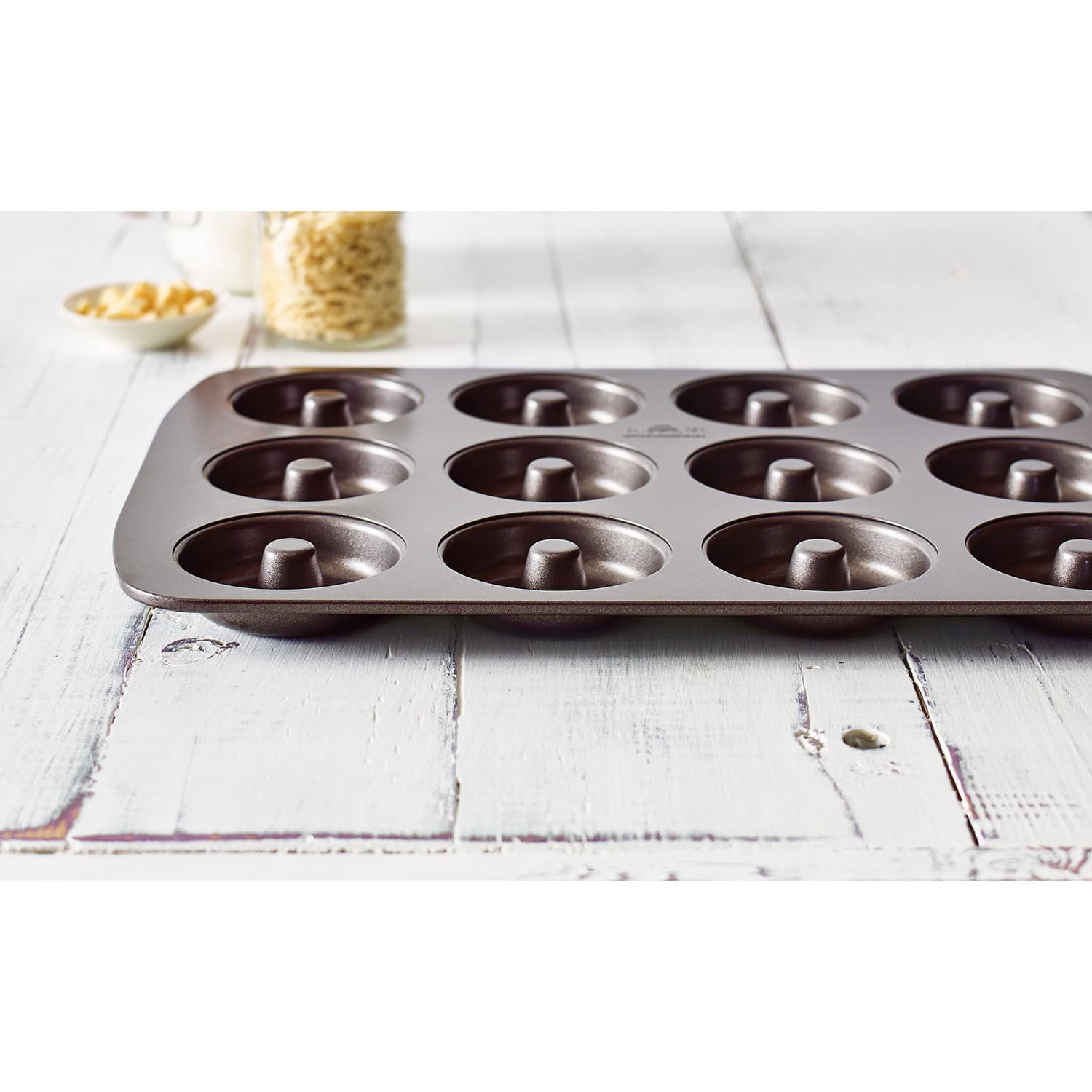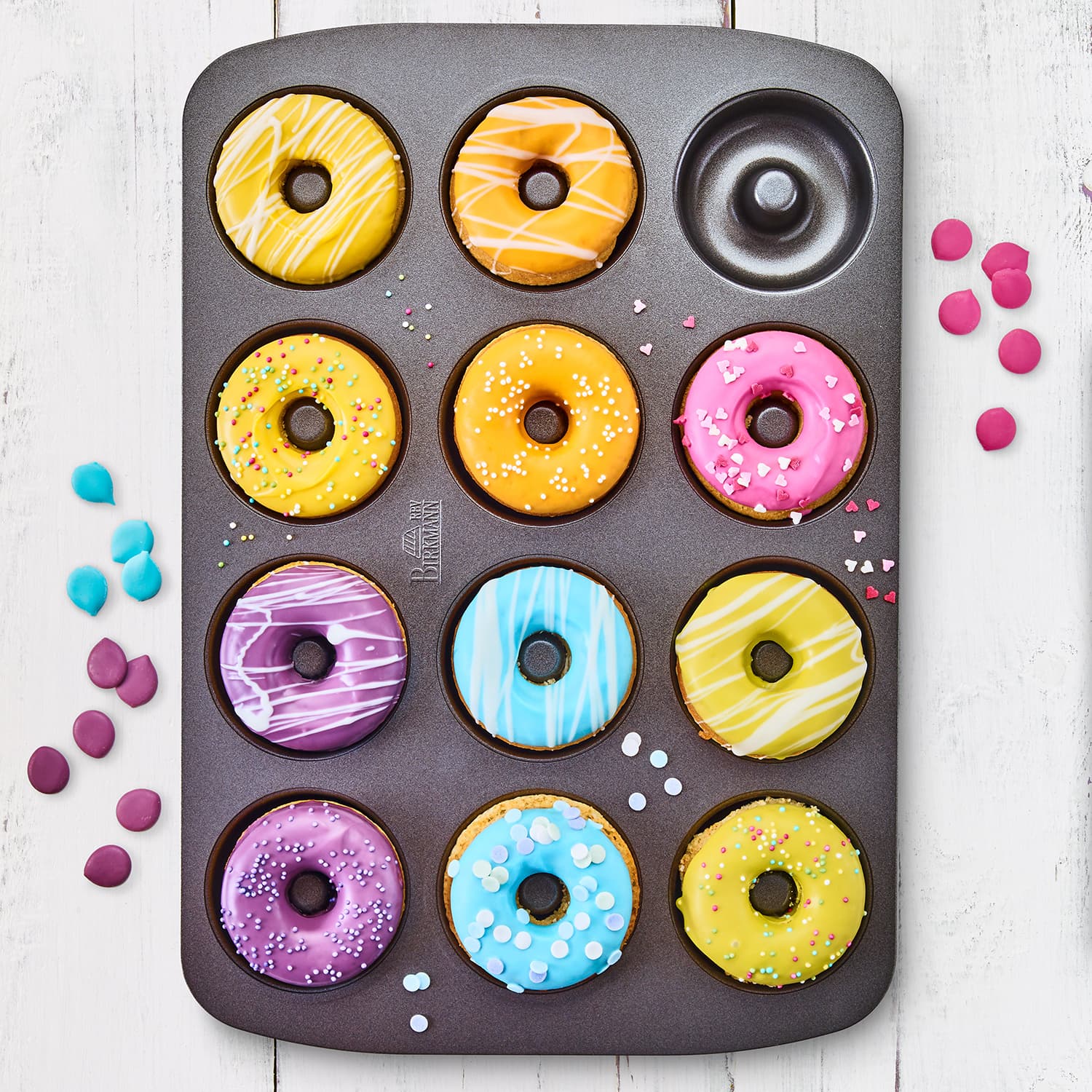 Hochwertiges Mini-Donut-Blech aus Karbonstahl mit Marken-Antihaftbeschichtung von Whitford. Die 12 Mulden haben einen Durchmesser von 7cm. Inkl. Rezeptheft und Rezeptvorschlag.