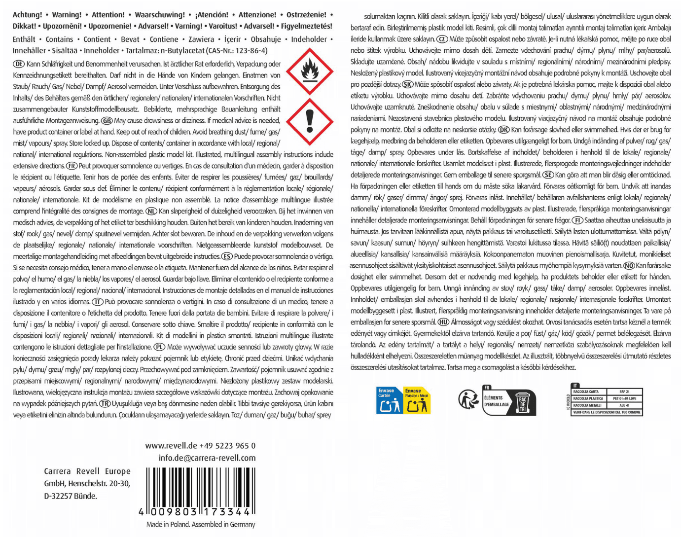 Achtung. Verpackung für spätere Rückfragen aufbewahren Kann Schläfrigkeit und Benommenheit verursachen Ist ärztlicher Rat erforderlich, Verpackung oder Kennzeichnungsetikett bereithalten. Darf nicht in die Hände von Kindern gelangen. Einatmen von Staub/Rauch/Gas/Nebel/Dampf/Aerosol vermeiden. Unter Verschluss aufbewahren. Entsorgung des Inhalts / des Behälters gemäß den örtlichen / regionalen / nationalen / internationalen Vorschriften.
