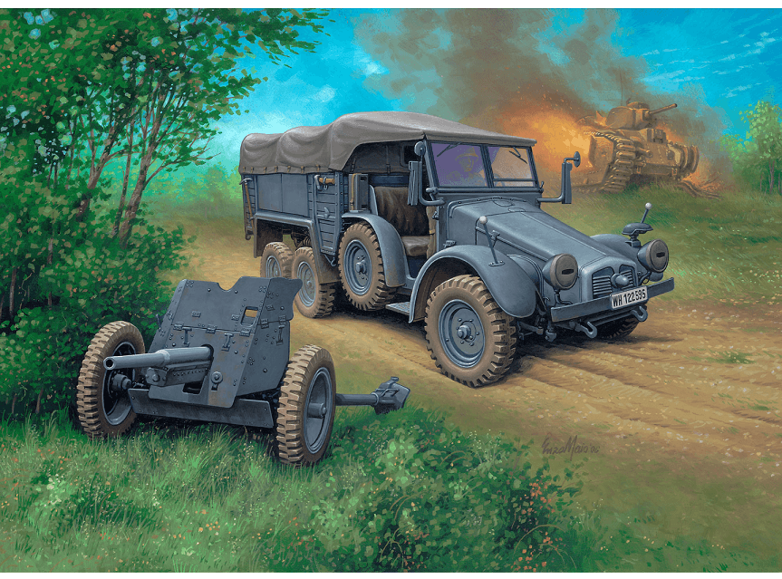 Die Krupp Protze KFZ 69 wurde in den 1930er Jahren als leichtes Zugfahrzeug für Panzerabwehrkanonen entwickelt und war ein typisches Transportfahrzeug der Wehrmacht im Zweiten Weltkrieg. Bekannt für ihre Robustheit, das unverwechselbare Design und den Allradantrieb war sie besonders auf schwierigem Gelände einsetzbar. Die 3,7 cm PaK, die sie häufig zog, zählte zu den wichtigsten leichten Panzerabwehrwaffen der frühen Kriegsjahre. Dieses Modell ermöglicht dir einen faszinierenden Einblick in die Technikgeschichte jener Zeit – verpackt in einem hochwertigen Starter Kit, das Geschichte greifbar macht.