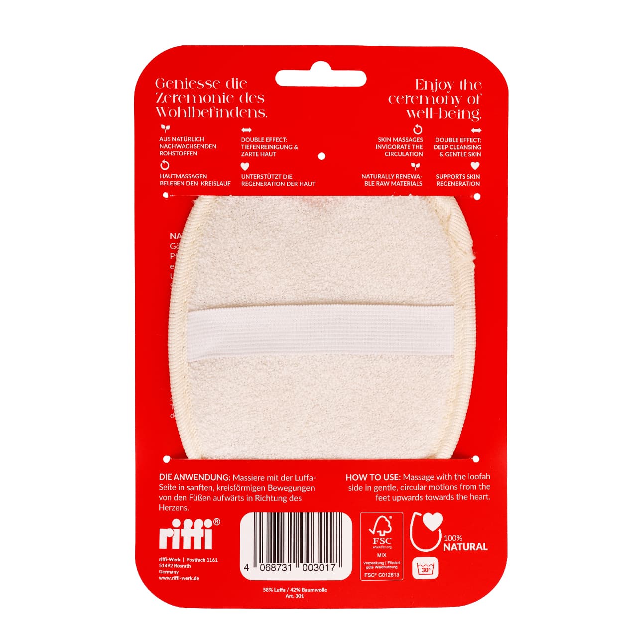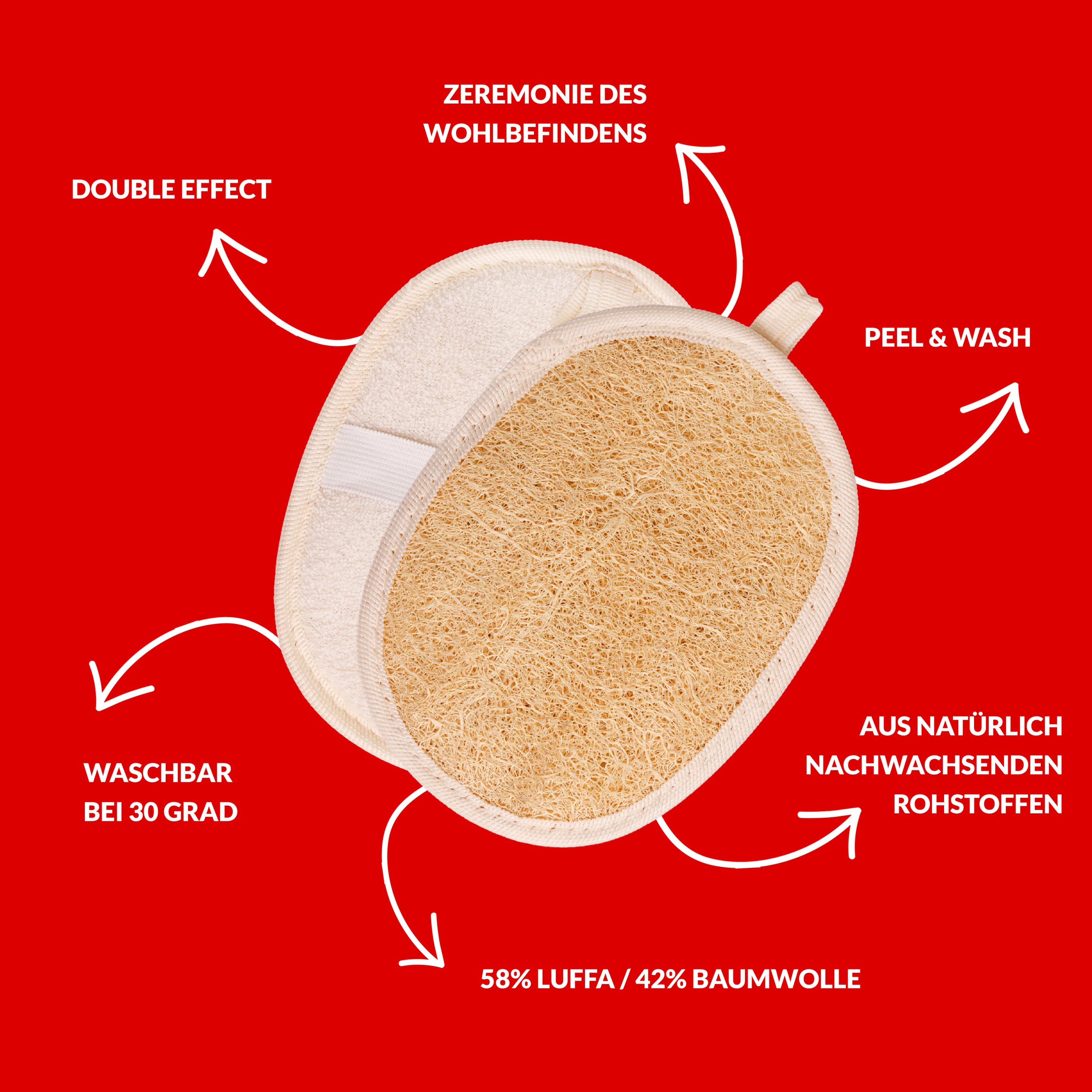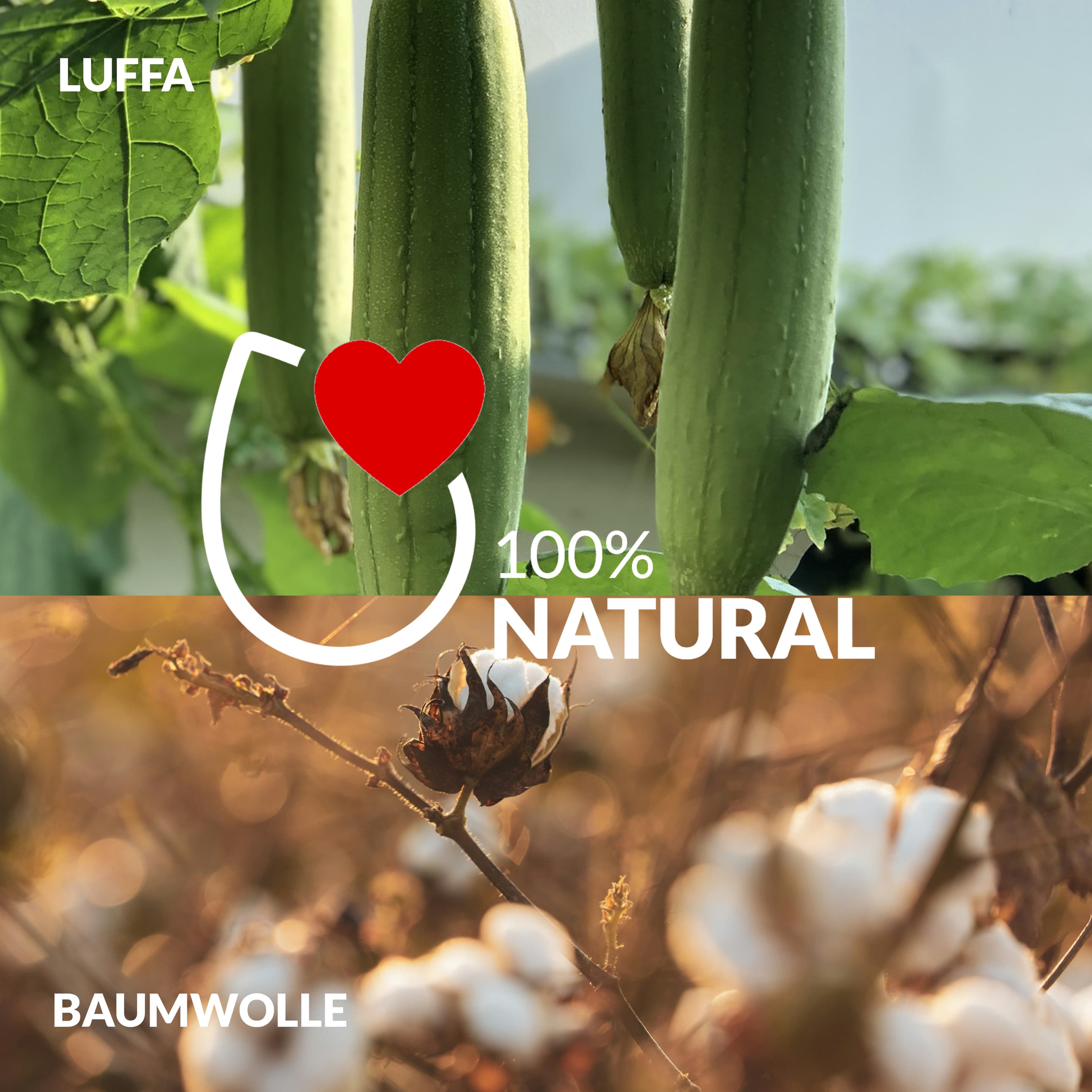 Erlebe die wohltuende Berührung eines Luffa-Massagepads auf deiner Haut. Für alle Hauttypen geeignet, Luffa ein wahres Geschenk der Natur. Hergestellt aus dem faserigen Inneren der reifen Luffa-Gurke, einem Kürbisgewächs der Tropen, bietet er eine gründliche, aber sanfte Peeling-Wirkung. Das natürliche Gewebe entfernt effektiv abgestorbene Hautschüppchen und unterstützt die Haut optimal bei ihrer Regeneration. Die weiche Baumwolle klärt und reinigt sanft nach.
