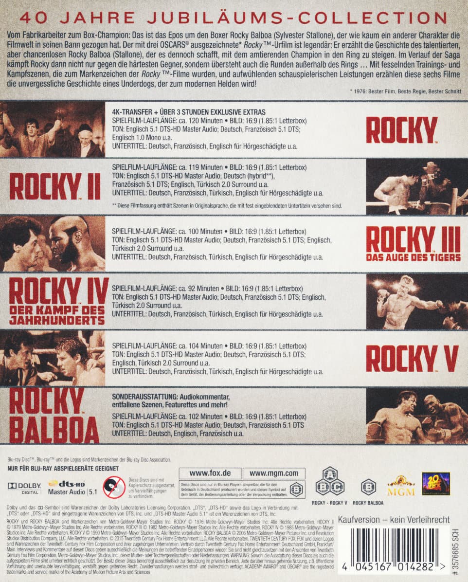 "Rocky" Rocky Balboa ist ein begnadeter Boxer. Doch der Weg zum Ruhm und zum großen Geld blieb ihm immer verwehrt. Als armer Fabrikarbeiter muss er ein schäbiges Dasein fristen. Da geschieht das Unglaubliche: Der Amateurboxer erhält die Möglichkeit, gegen den Schwergewichtsweltmeister Apollo Creed anzutreten. Was als PR-Gag geplant ist, entpuppt sich als brutaler und gnadenloser Kampf, denn der ehrgeizige Rocky will sich die Chance seines Lebens von niemandem nehmen lassen. Laufzeit: 120 Min. Produktionsjahr: 1976 Regie: John G. Avildsen Darsteller: Talia Shire, Joe Spinell, David Thayer; "Rocky II" Rocky Balboa ist zurückgekehrt. Zwar hat der farbige Champion Apollo Creed im letzten Kampf nach Punkten gewonnen, doch der wahre Sieger heißt Rocky. Er ist vom krassen Außenseiter zum Star avanciert. Aber das schnell verdiente Geld ist schnell wieder ausgegeben. Schon bald steht Rocky vor dem Nichts. Ihm bleibt keine Wahl - er nimmt die erneute Herausforderung von Apollo an. Ein zweites Mal tritt er gegen den Weltmeister an - nur diesmal geht es nicht mehr nur um den Titel, es geht um die Existenz. Laufzeit: 119 Min. Produktionsjahr: 1979 Regie: Sylvester Stallone Darsteller: Tony Burton, Burgess Meredith, Carl Weathers; "Rocky III - Das Auge des Tigers" Rocky hat alles erreicht: Weltmeistertitel, Luxusvilla, teure Maßanzüge - bis er eines Tages auf den stärksten und gefährlichsten Gegner trifft, der ihm je gegenüberstand. Clubber Lang, ein Schwarzer, der ihn in der ersten Begegnung K.O. schlägt. Rockys Selbstvertrauen ist schwer erschüttert. Seine einzige Chance, seinen alten Killerinstinkt und damit den Titel wiederzuerlangen, ist, zu seinen Anfängen zurückzukehren. Nach einem mörderischen Training treffen ihn wieder die vernichtenden Schläge von Clubber Land. Aber diesmal schlägt Rocky zurück... Laufzeit: 100 Min. Produktionsjahr: 1982 Regie: Sylvester Stallone Darsteller: Tony Burton, Hulk Hogan, Mr. T; "Rocky IV - Der Kampf des Jahrhunderts" Der Kampf des Jahrhunderts. Er ist stärker als Apollo Creed und hinterhältiger als Clubber Lang: Ivan Drago, die Kampfmaschine aus der Sowjetunion. Russische Wissenschaftler haben den "Athleten der Zukunft" geschaffen, der mit tödlicher Kraft zuschlägt. Das muss als erster Rockys ehemaliger Gegner und Freund Apollo in einem mörderischen Kampf erfahren. Wenig später fordert Drago Rocky Ballboa heraus. Diesem Kampf kann er nicht ausweichen. Rocky Balboa, der "italienische Hengst" - eine legendäre Filmfigur geht in die 4. Runde. Laufzeit: 92 Min. Produktionsjahr: 1985 Regie: Sylvester Stallone Darsteller: Dolph Lundgren, Brigitte Nielsen, Michael Pataki; "Rocky V" Rocky Balboa hat alles erreicht, was eine Boxerkarriere hergibt. Nun kehrt er zu seinen Ursprüngen zurück. Gesundheitlich angegriffen und finanziell ruiniert sieht der einstige Champ für sich keine Zukunft mehr im Ring. Er zieht mit seiner Familie in die Slums von Philadelphia, von wo aus er als junger Mann einst aufgebrochen war, um eine Boxlegende zu werden. Dort will er sich als Trainer ein neues Leben aufbauen und entdeckt Tommy Gunn, einen talentierten Schläger, auf den er seine ganzen Hoffnungen setzt. Aber er kann den vielversprechenden Jungboxer gegen die mächtigen Boxställe nicht halten. Als Tommy den alten Profi provozierend zu einem Fight auffordert, zeigt Rocky, dass sein Siegeswille noch immer ungebrochen ist... Laufzeit: 104 Min. Produktionsjahr: 1990 Regie: John G. Avildsen Darsteller: Richard Gant, Tommy Morrison, Sage Stallone; "Rocky Balboa" Rocky hat sich nach dem Tod seiner Frau aus der Boxszene zurückgezogen. Als Besitzer eines kleines Restaurants schlägt er sich durchs Leben. Doch als im TV ein virtueller Kampf zwischen ihm und dem amtierenden Weltmeister Mason "The Line" Dixon ausgestrahlt wird weckt das Rockys Boxleidenschaft. Er entschließt sich tatsächlich gegen den um Jahre jüngeren Boxweltmeister anzutreten. Laufzeit: 102 Min. Produktionsjahr: 2006 Regie: Sylvster Stallone Darsteller: A.J. Benza, Tony Burton, Geraldine Hughes, Sylvester Stallone, Antonio Traver, Milo Ventimiglia, Burt Young;