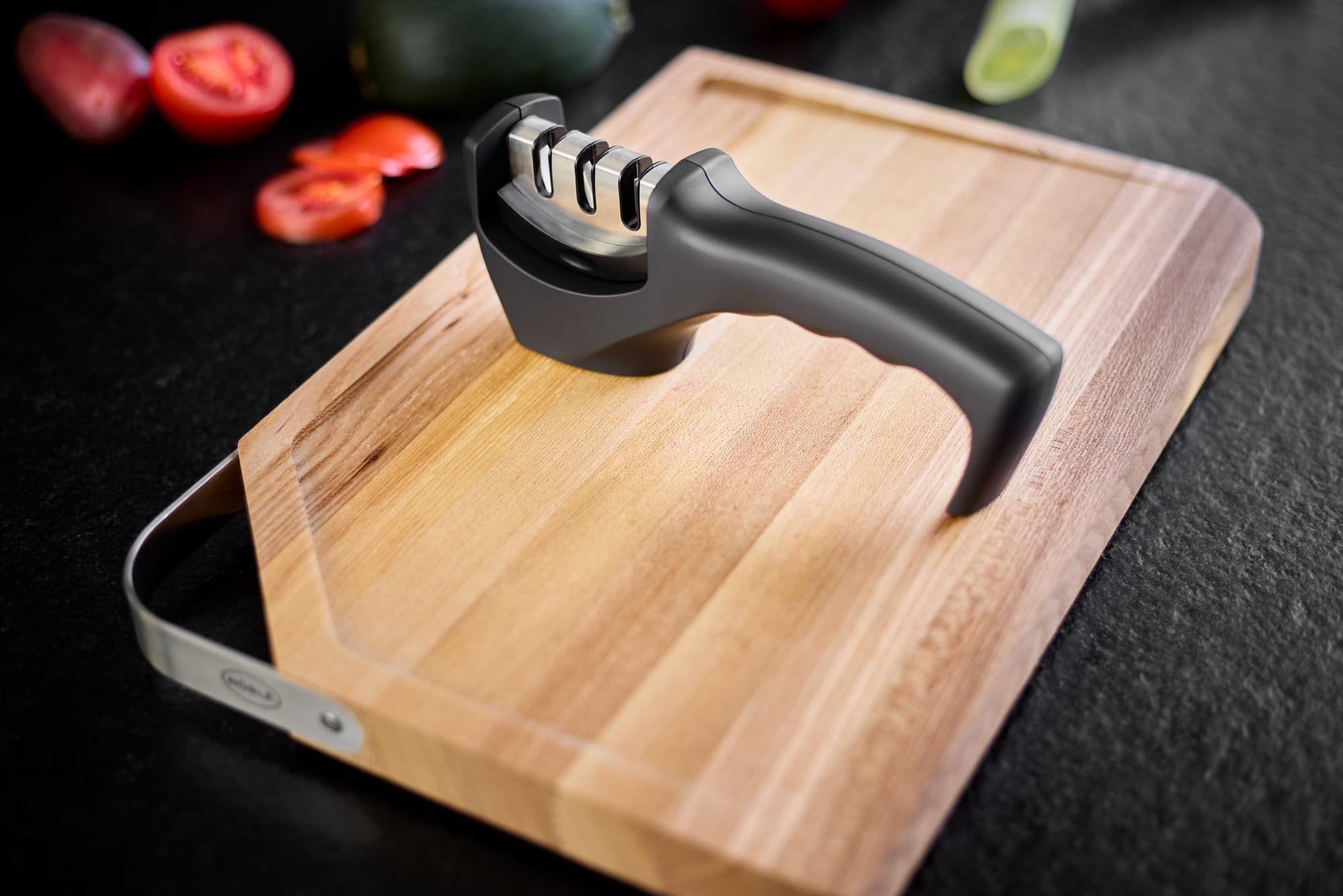 Auch hochwertige Messer brauchen immer mal wieder einen frischen Schliff. Wer mit einem Wetzstahl nicht gut klar kommt, hat mit dem Messerschärfer Erfolg. Er bringt alles mit, damit auch Ungeübte immer ein scharfes Messer zur Hand haben.