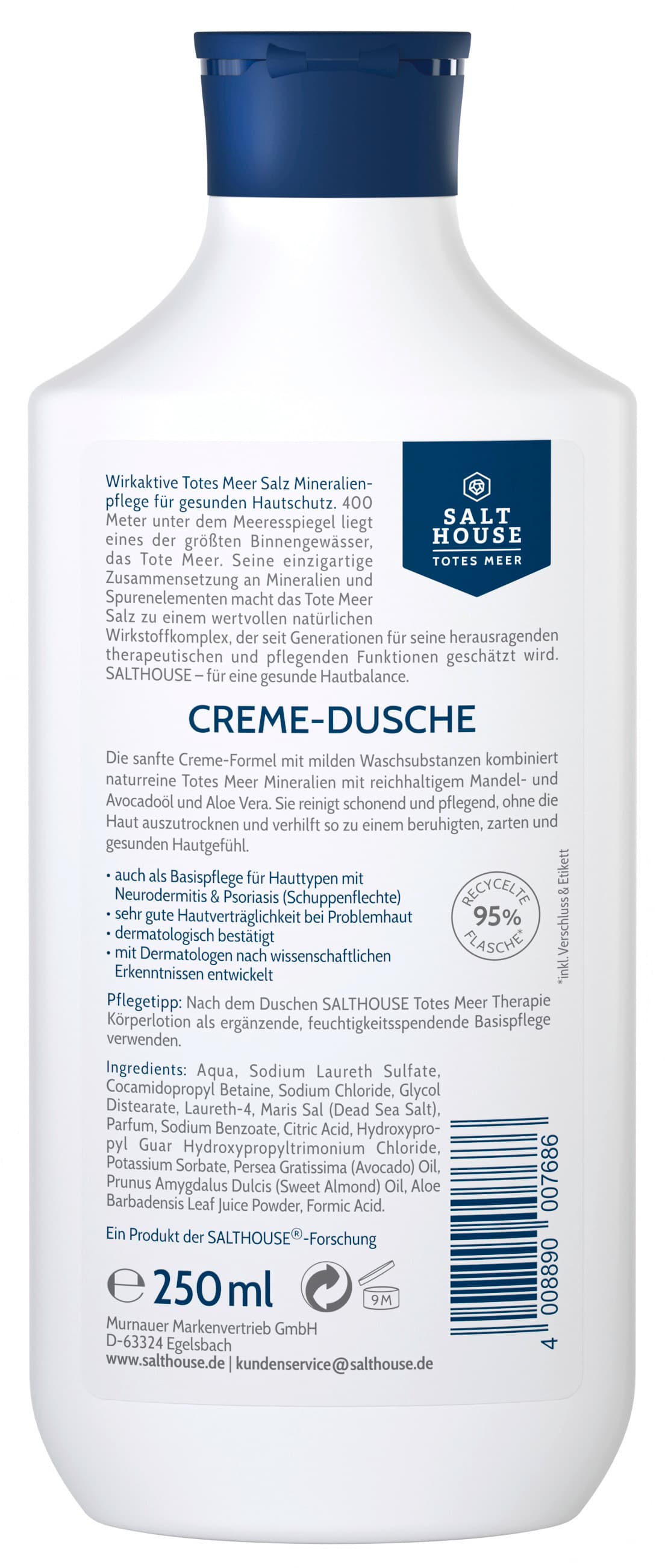 | Inhaltsstoffe | Aqua, Sodium Laureth Sulfate, Cocamidopropyl Betaine, Sodium Chloride, Glycol Distearate, Maris Sal (Dead Sea Salt), Laureth-4, Aloe Barbadensis Leaf Juice Powder, Persea Gratissima (Avocado) Oil, Prunus Amygdalus Dulcis (Sweet Almond) Oil, Polyquaternium-10, Benzyl Alcohol, Parfum, Sodium Benzoate, Formic Acid, Citric Acid, Potassium Sorbate. |