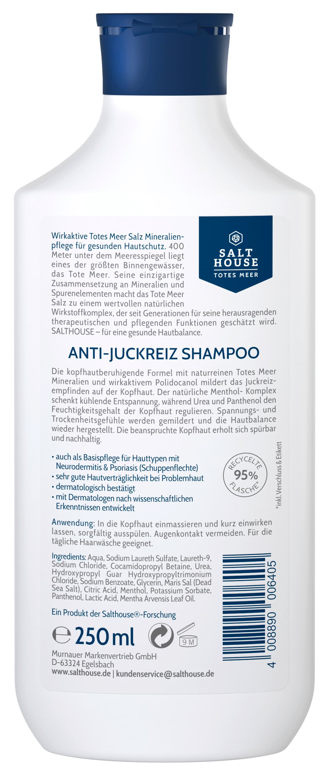 Speziell für juckende Kopfhaut ist die feuchtigkeitsspendende Formel desANTI-JUCKREIZ SHAMPOO entwickelt, die mit naturreinen Totes MeerMineralien und wirkaktivem Polidocanol die Kopfhaut sofort beruhigt und dasJuckreizempfinden mildert.Natürliches Minzöl schenkt kühlende Entspannung, während Urea und Panthenol den Feuchtigkeitshaushalt der Kopfhaut regulieren.Spannungs- und Trockenheitsgefühle werden gemildert und die Hautbalance wieder hergestellt. So kann sich die beanspruchte Kopfhaut spürbar und nachhaltig erholen.