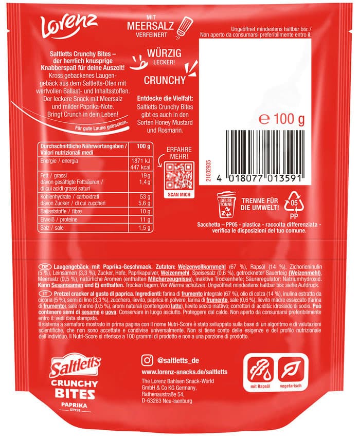 Saltletts Crunchy Bites - der herrlich knusprig würzige Knabberspaß für deine Auszeit! Kross gebackenes Laugengebäck aus dem Saltletts-Ofen mit wertvollen Ballast- und Inhaltsstoffen. Der leckere Snack mit Meersalz und milder Paprika-Note. Bringt Crunch in dein Leben. Einfach lecker, jederzeit und überall - ob als leckerer Snack für zwischendurch, gemütliche Abende allein oder zum Teilen mit Freunden. Unverfälschter Geschmack durch sorgfältig ausgewählte Zutaten. Mit Vollkornmehl und leckeren Leinsamen. Ohne zugesetzte Geschmacksverstärker, geeignet für Vegetarier, Ballaststoffquelle. Es gibt die Crunchy Bites im standfesten Beutel (100 g). Die Verpackung ist recyclingfähig.