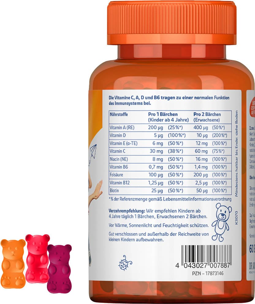 InhaltsstoffeSüßungsmittel Maltit, modifizierte Stärke, Vitamin C, Säuerungsmittel Citronensäure, Nicotinamid, färbende Lebensmittelkonzentrate (Karotte, Apfel, Schwarze Johannisbeere, Kirsche), Vitamin E, natürliches Orangenaroma, natürliche Aromen, pflanzliche Öle (Kokosnuss, Raps), Vitamin B6, Süßungsmittel Sucralose, Überzugsmittel Carnaubawachs, Retinylpalmitat, Pteroylmonoglutaminsäure, D-Biotin, Cholecalciferol, Cyanocobalamin