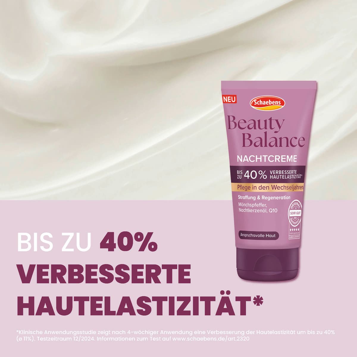 Bestätigte Wirksamkeit *Klinische Anwendungsstudie zeigt nach 4-wöchiger Anwendung eine Verbesserung der Hautelastizität um bis zu 40% (ø 11%). Testzeitraum 12/2024. Informationen zum Test auf www.schaebens.de/art.2320