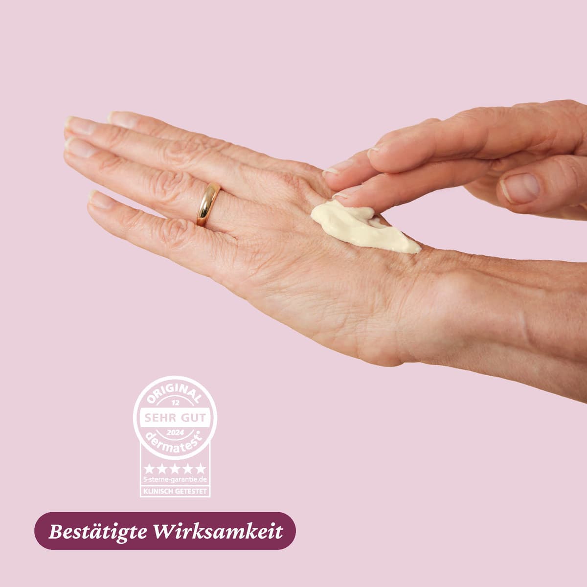 | Inhaltsstoffe | Aqua, Glycerin, Cetearyl Alcohol, Caprylic/Capric Triglyceride, Glyceryl Stearate, Isopropyl Palmitate, Glyceryl Stearate Citrate, Butyrospermum Parkii Butter, Oenothera Biennis Oil, Panthenol, Ascorbyl Palmitate, Helianthus Annuus Seed Oil, Rosa Damascena Flower Water, Tocopherol, Ubiquinone, Vitex Agnus-Castus Extract, Alcohol, Benzoic Acid, Dehydroacetic Acid, Lactic Acid, Parfum, Phenoxyethanol, Potassium Sorbate, Sodium Benzoate, Sodium Hydroxide, Sodium Phytate, Sorbic Acid, Xanthan Gum, Tetramethyl Acetyloctahydronaphthalenes. |