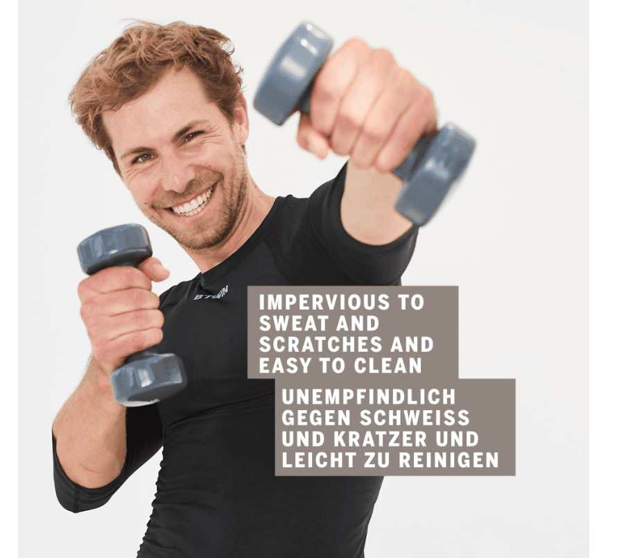 Die Hanteln besitzen einen Kern aus Gusseisen, der für das nötige Gewicht sorgt. Ummantelt sind sie mit einem strapazierfähigen und griffigen Vinyl-Material. Diese Oberfläche ist unempfindlich gegenüber Schweiß, lässt sich leicht reinigen und beugt Kratzern auf dem Boden vor. Die sechseckige Form der Hantelköpfe verhindert zudem, dass die Gewichte auf dem Boden wegrollen.