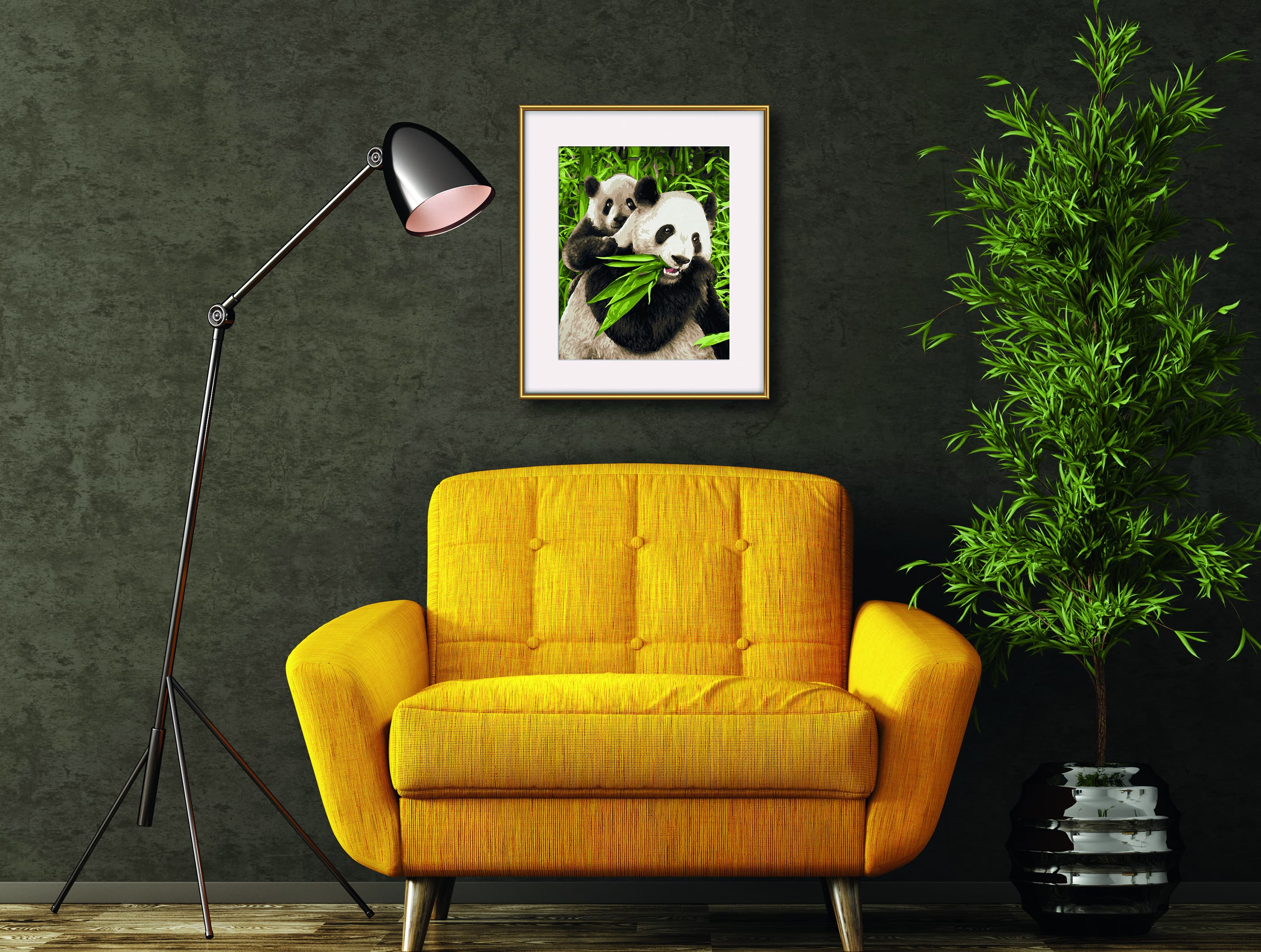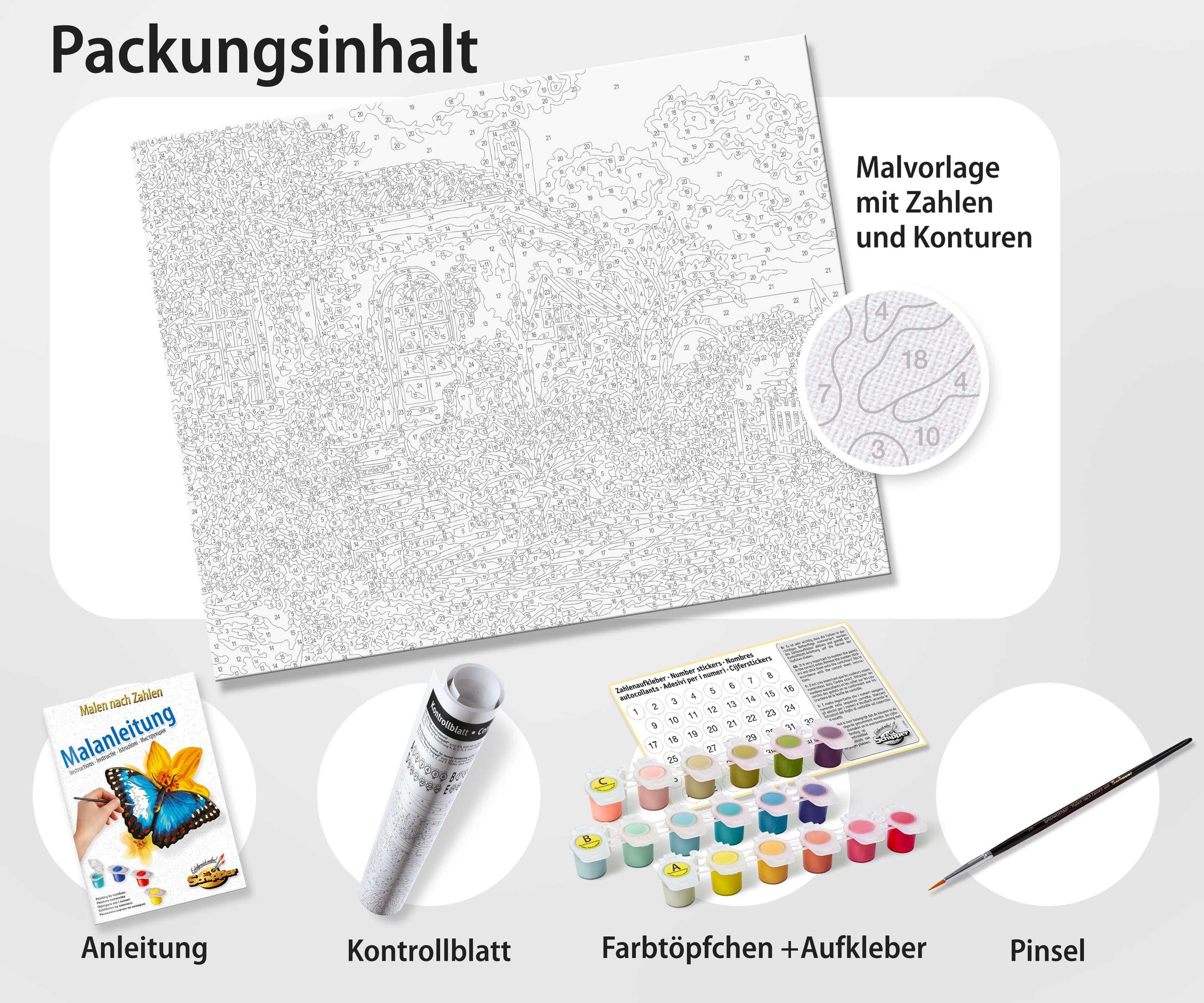Das Motiv: “Pandabären”Sein Name ist Großer Panda. Er wird aber auch Riesenpanda oder Bambusbär genannt. Das Wappentier des WWF ist trotz Artenschutz seit 1939 vom Aussterben bedroht. Der Pandabär ernährt sich hauptsächlich von Bambus und vertilgt täglich bis zu 30 kg. Drollig ist, wenn er zum Fressen eine sitzende Haltung einnimmt. Wegen seines Aussehens und dem friedlichen Wesen ist er, besonders bei Kindern, eines der beliebtesten Tiere und bietet ein schönes Motiv für alle großen und kleinen Hobbykünstler.Das Bildformat und Malvorlage:“MEISTERKLASSE Klassiker”. Bilder im Format 24 x 30 cm passen in handelsübliche Wechselrahmen, die in Baumärkten preiswert zu haben sind. Für eine kleine Bildergalerie können sie schön gruppiert und dekorativ aufgehängt werden. Die Malvorlage hat eine fühl- und sichtbare Leinenstruktur. Sie bewirkt nicht nur eine wesentlich verbesserte Optik des fertigen Gemäldes, sondern unterstreicht auch den malerischen Charakter des Bildes und unterstützt den gewünschten “Öl-auf-Leinwand-Effekt”.Der Packungsinhalt:Stabiler Malkarton mit Leinenstruktur 24 x 30 cm. Exakte Konturenzeichnungen mit gut lesbaren Zahlen. Acrylfarben auf Wasserbasis. Kein Farbmischen erforderlich. Feiner Malpinsel. Kontrollblatt und ausführliche Anleitung für erfolgreiches Malen.
