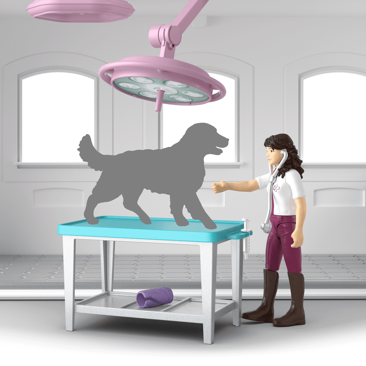 Mrs Kramer hat eine neue Pferdeklinik! In der handlichen Box ist alles verstaut, was die Tierärztin braucht: In der Praxis stehen ein Röntgengerät und ein OP-Tisch, in der praktischen Verstauklappe im Dach liegen Pflaster, Bandage, Stethoskop und Spritze bereit. Auf der anderen Seite der Praxis befindet sich eine geräumige Pferdebox für den Andalusier Hengst mit Tränke, Raufe und Äpfeln. Perfekt!