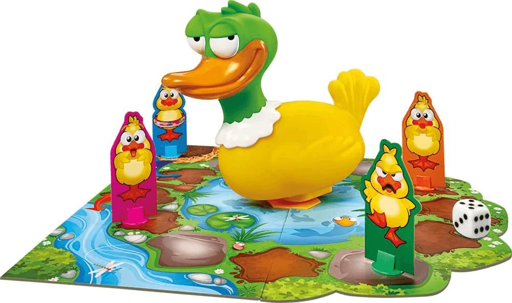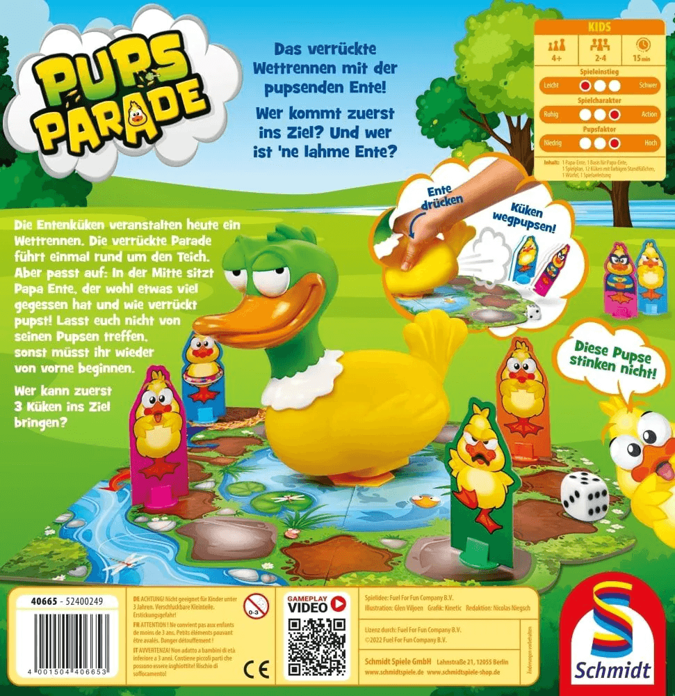 Die Entenküken veranstalten heute ein Wettrennen. Die verrückte Parade führt einmal rund um den Teich. Aber passt auf: In der Mitte sitzt Papa Ente, der wohl etwas viel gegessen hat und wie verrückt pupst! Lasst euch nicht von seinen Pupsen treffen, sonst müsst ihr wieder von vorne beginnen. Wer kann zuerst 3 Küken ins Ziel bringen? Wer gewinnt das witzige Wettrennen? Und wer ist ‘ne lahme Ente?
