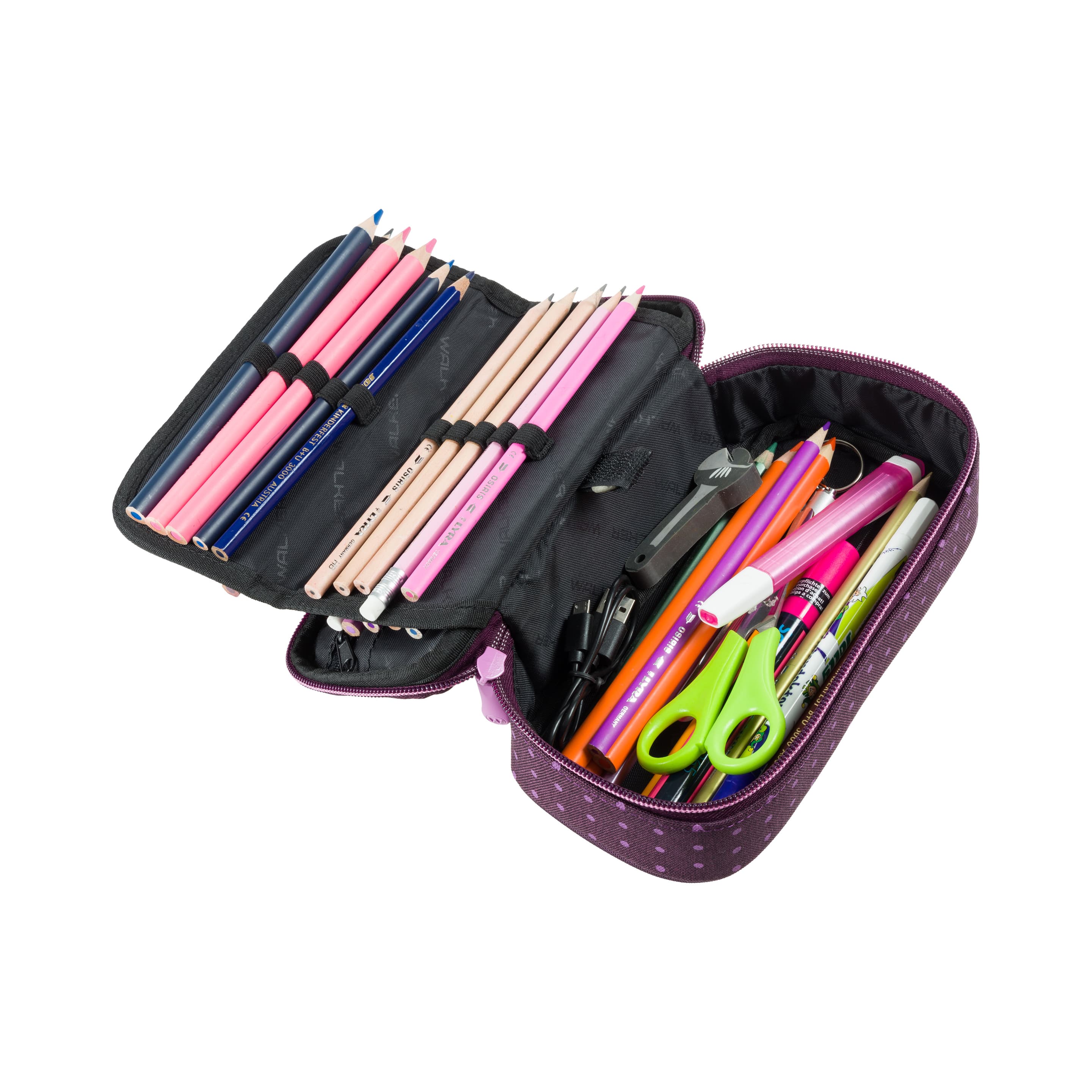 geräumiges Hauptfach, doppelseitige Trennwand mit 20 Stiftfächern, Trennfach mit Organisierfunktion und Zippfach, passend designed zum Rucksack, wasser- und schmutzabweisende Beschichtung Material: 600D Polyester