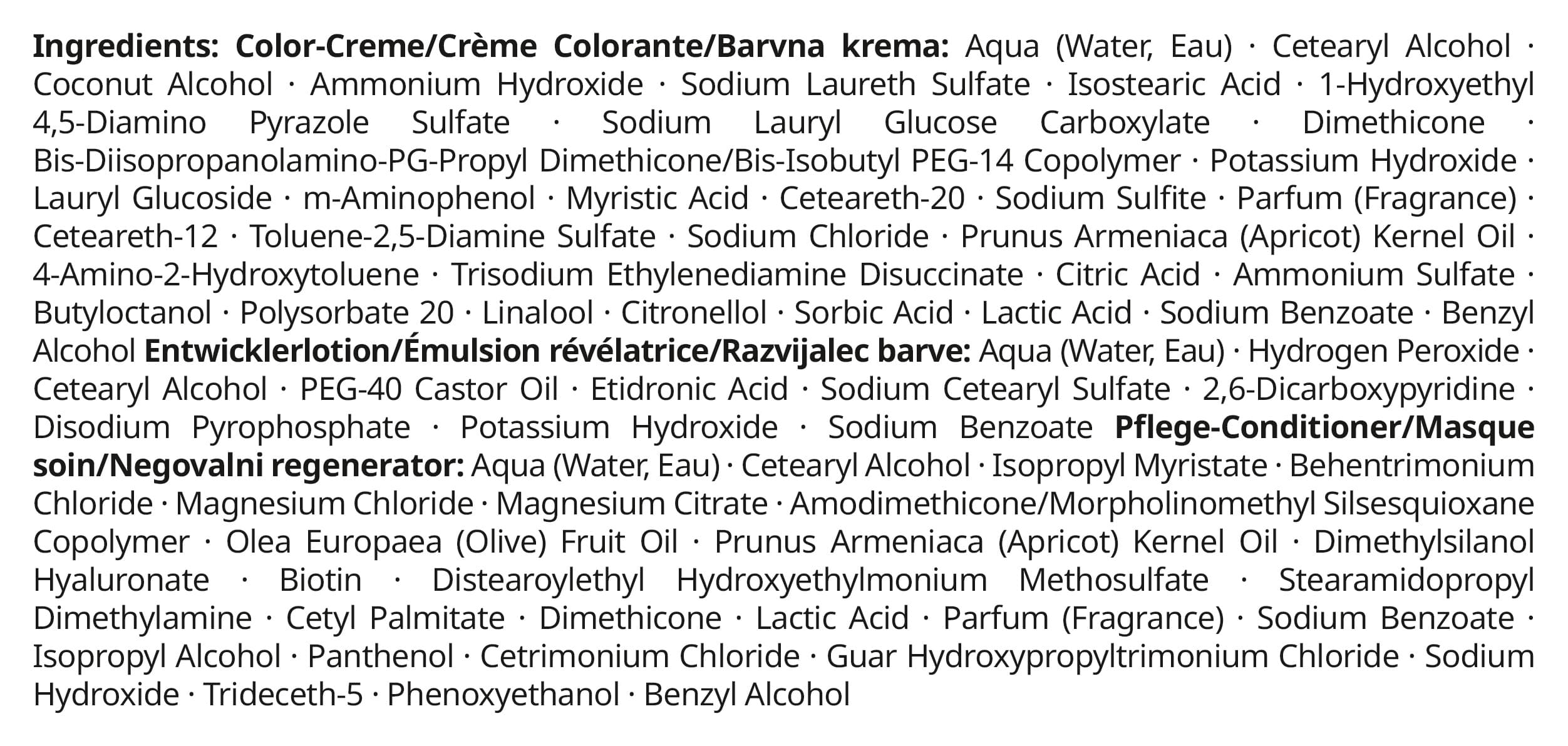 Inhaltsstoffe Color-Creme/Crème Colorante/Barvna krema: Aqua (Water, Eau), Cetearyl Alcohol, Coconut Alcohol, Ammonium Hydroxide, Sodium Laureth Sulfate, Isostearic Acid, 1-Hydroxyethyl 4,5-Diamino Pyrazole Sulfate, Sodium Lauryl Glucose Carboxylate, Dimethicone, Bis-Diisopropanolamino-PG-Propyl Dimethicone/Bis-Isobutyl PEG-14 Copolymer, Potassium Hydroxide, Lauryl Glucoside, m-Aminophenol, Myristic Acid, Ceteareth-20, Sodium Sulfite, Parfum (Fragrance), Ceteareth-12, Toluene-2,5-Diamine Sulfate, Sodium Chloride, Prunus Armeniaca (Apricot) Kernel Oil, 4-Amino-2-Hydroxytoluene, Trisodium Ethylenediamine Disuccinate, Citric Acid, Ammonium Sulfate, Butyloctanol, Polysorbate 20, Linalool, Citronellol, Sorbic Acid, Lactic Acid, Sodium Benzoate, Benzyl Alcohol|Entwicklerlotion/Émulsion révélatrice/Razvijalec barve: Aqua (Water, Eau), Hydrogen Peroxide, Cetearyl Alcohol, PEG-40 Castor Oil, Etidronic Acid, Sodium Cetearyl Sulfate, 2,6-Dicarboxypyridine, Disodium Pyrophosphate, Potassium Hydroxide, Sodium B