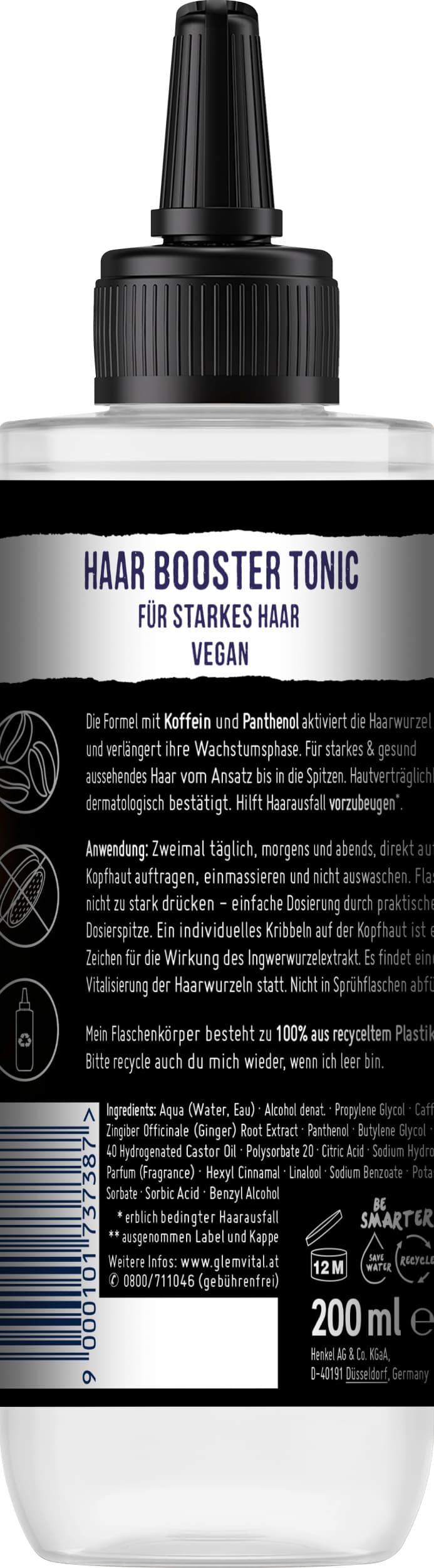 Glem Vital Koffein Haar Booster Tonic. Für starkes Haar. Die Formel mit Koffein und Panthenol aktiviert die Haarwurzel und verlängert ihre Wachstumsphase. Für starkes& gesund aussehendes Haar vom Ansatz bis in die Spitzen. Hautverträglichkeit dermatologisch bestätigt. Hilft Haarausfall vorzubeugen.*