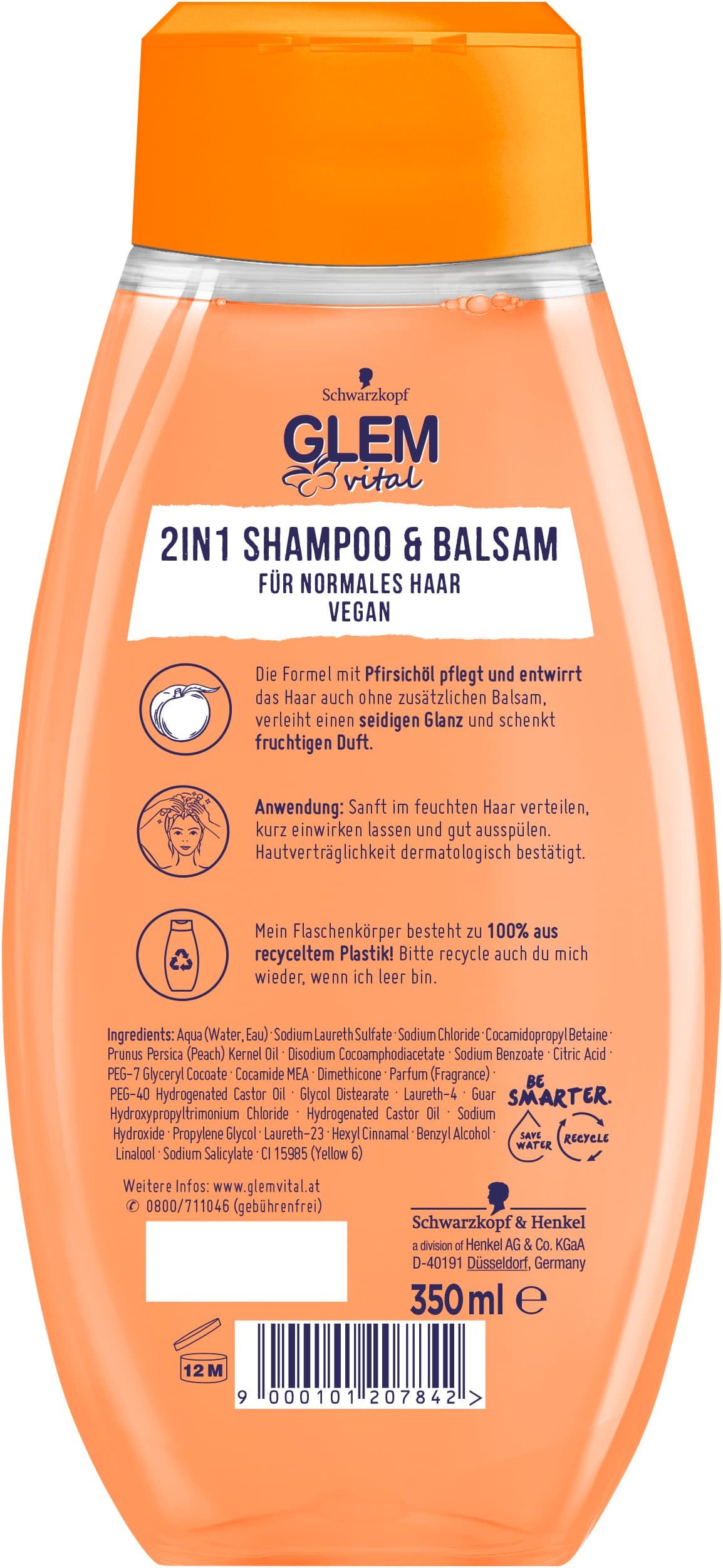 Mit dem 2in1 Shampoo und Balsam von Glem vital wird normales Haar mit wertvollem Pfirsichöl gepflegt. Das Haar wird seidig-glänzend und bekommt einen himmlischen Duft. Dabei ist die Haarpflege frei von Silikonen und entwirrt Ihre Haare auch ohne zusätzlichen Balsam. Für gepflegtes und wunderbar schönes Haar.