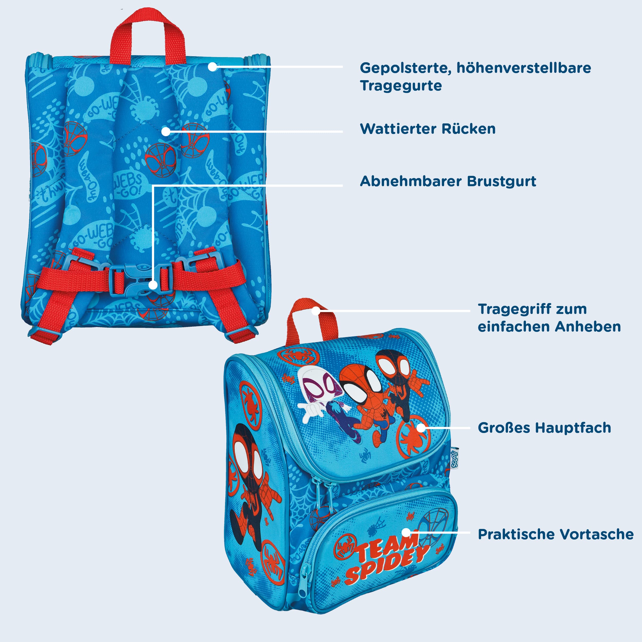 Der Scooli Cutie Spider-Man Vorschulranzen begeistert kleine Netzschwinger mit seinem actiongeladenen Design und der durchdachten Ausstattung. Das Hauptfach mit Reißverschluss bietet ausreichend Platz für Brotdose, Trinkflasche und kleine Schätze. Für zusätzlichen Komfort sorgen die gepolsterten Schultergurte mit Mesh-Einsatz sowie die leicht wattierte Rückenpartie. Der abnehmbare Brustgurt hält den Rucksack sicher am Körper und kann bei Bedarf einfach entfernt werden. Mit einem Gewicht von nur 340 g und den Maßen 23 × 21 × 13 cm ist der Kinderrucksack leicht, handlich und optimal auf Vorschulkinder abgestimmt. Ein idealer Begleiter für Kindergarten, Freizeit oder Ausflüge und ein echtes Highlight für alle Spider-Man-Fans.