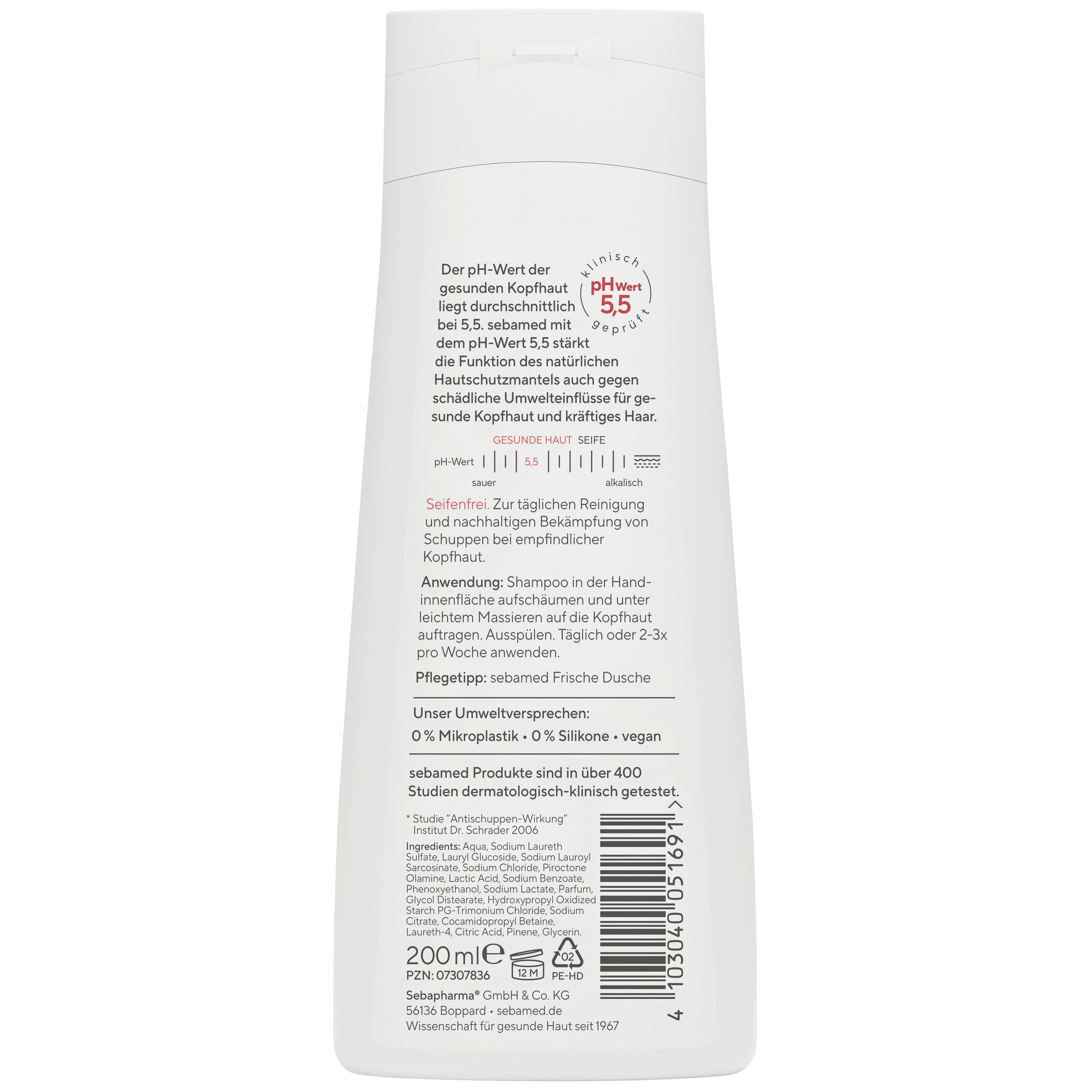 Antischuppen Shampoo, für normales Haar. Pircotone Olamine. Nach 4 Wochen bis zu 95% weniger Schuppen.* Vermindert Schuppen, hilft Reizungen zu lindern. Zur täglichen Reinigung und nachhaltigen Bekämpfung von Schuppen bei empfindlicher Kopfhaut.Unser Umweltversprechen: 0% Mikroplastik, 0% Silikone, vegan.sebamed Produkte sind in über 400 Studien dermatologisch-klinisch getestet. Medizinische Hautpflege. Made in Germany.* Studie “Antischuppen-Wirkung” Institut Dr. Schrader 2006.
