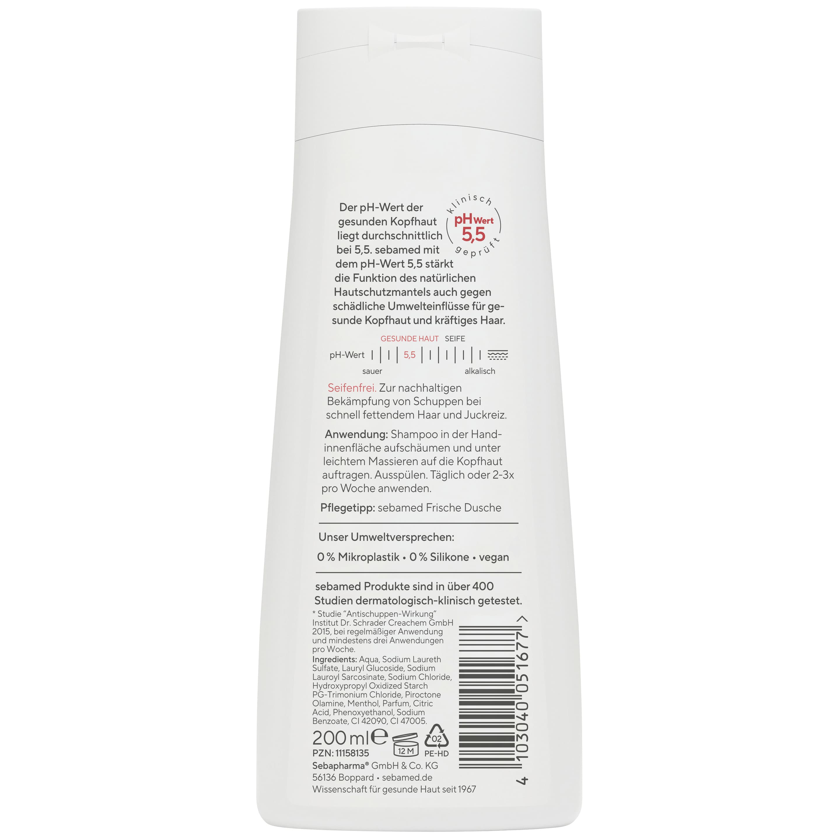 Antischuppen Shampoo Plus, für fettendes Haar. Pircotone Olamine. Nach 4 Wochen bis zu 95% weniger Schuppen.* Reinigt schnell fettendes Haar, lindert Juckreiz, beugt der Neubildung von Schuppen vor. Zur nachhaltigen Bekämpfung von Schuppen bei schnell fettendem Haar und Juckreiz.Unser Umweltversprechen: 0% Mikroplastik, 0% Silikone, vegan.sebamed Produkte sind in über 400 Studien dermatologisch-klinisch getestet. Medizinische Hautpflege. Made in Germany.* Studie “Antischuppen-Wirkung” Institut Dr. Schrader Creachem GmbH 2015, bei regelmäßiger Anwendung und mindestens drei Anwendungen pro Woche