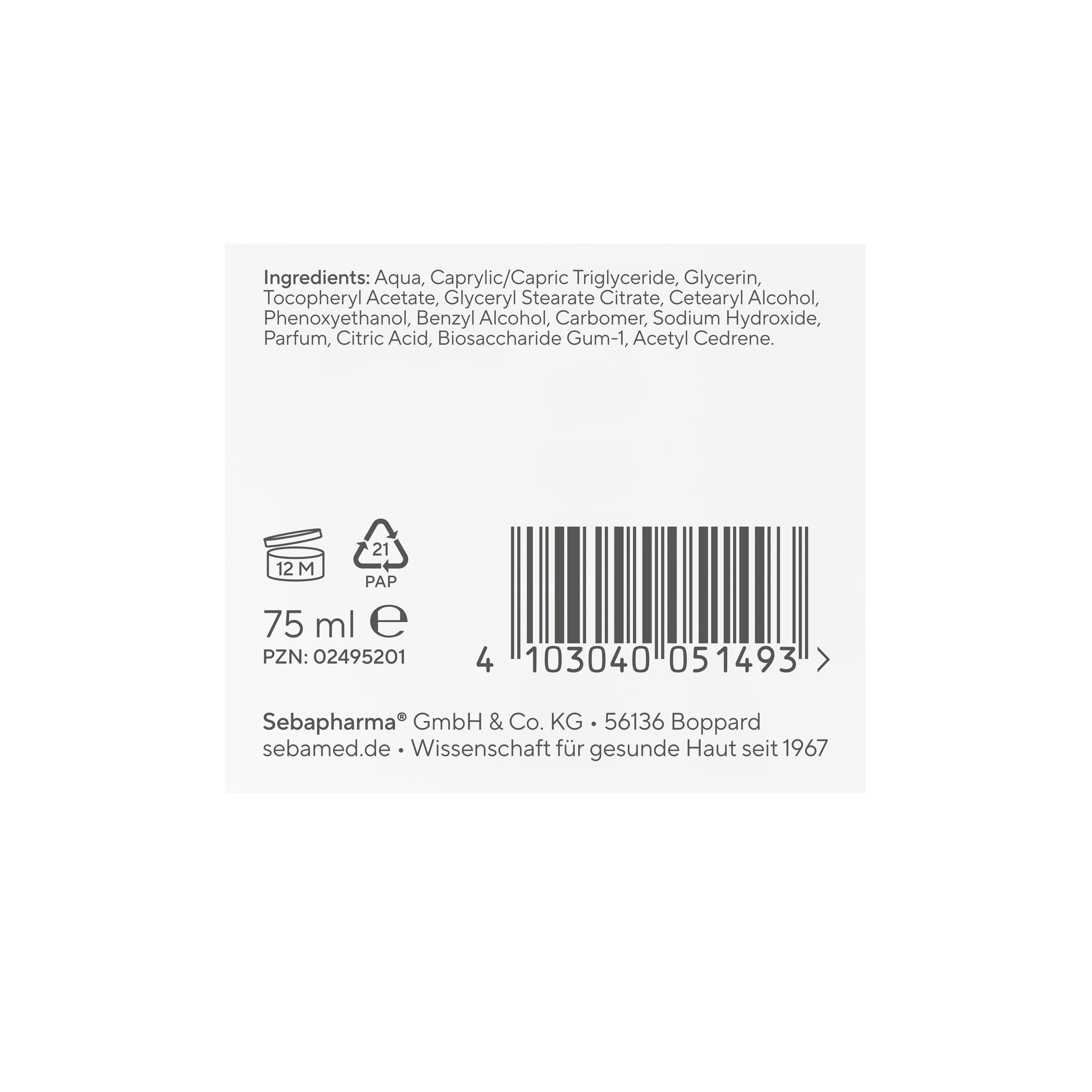 | Inhaltsstoffe | Aqua, Caprylic/Capric Triglyceride, Glycerin, Tocopheryl Acetate, Glyceryl Stearate Citrate, Cetearyl Alcohol, Phenoxyethanol, Benzyl Alcohol, Carbomer, Sodium Hydroxide, Parfum, Citric Acid, Biosaccharide Gum-1, Acetyl Cedrene. |