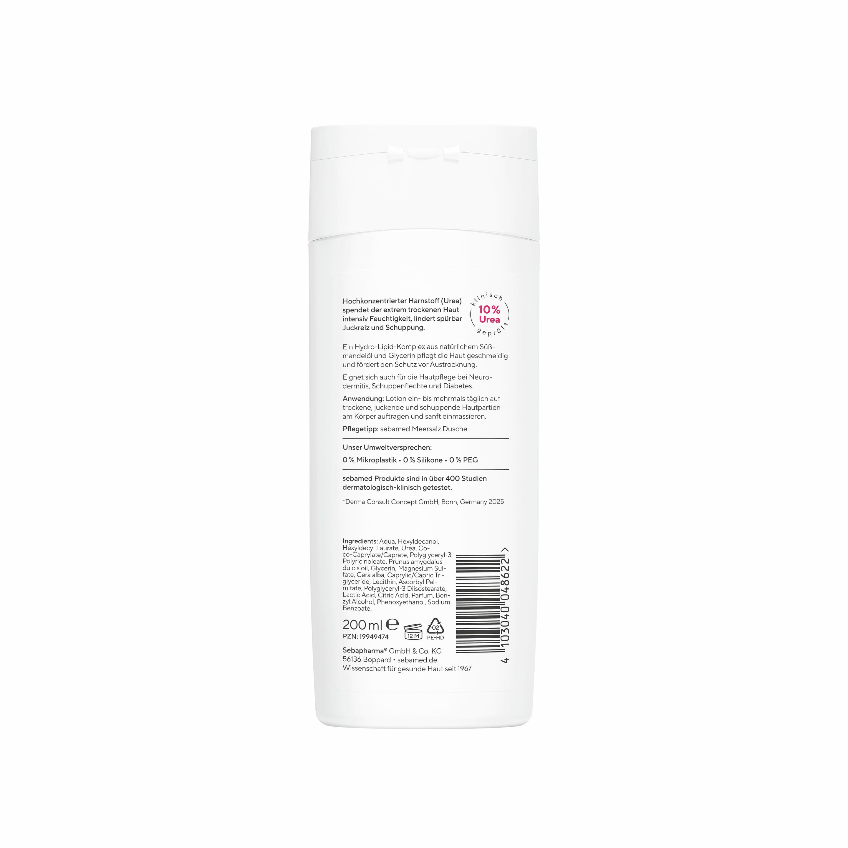 Ihre ausgesuchten Inhaltsstoffe lindern spürbar Spannungsgefühl, Rauheit und Juckreiz bei sehr trockener Haut und helfen, die natürliche Feuchtigkeitsbalance der Haut wieder herzustellen. Hochkonzentrierter Harnstoff (Urea) spendet intensiv Feuchtigkeit, lindert spürbar Juckreiz und hilft, sehr trockene Haut zu glätten. Ein Hydro-Lipid-Komplex aus natürlichem Süßmandelöl und Polyol pflegt die Haut geschmeidig und fördert den Schutz vor Austrocknung. Nachweisliche Verbesserung nach 2 Wochen: Reduzierung der Trockenheit der Haut um 86% (Quelle: Hautklinik der HSK-Kliniken Wiesbaden, 2008).
