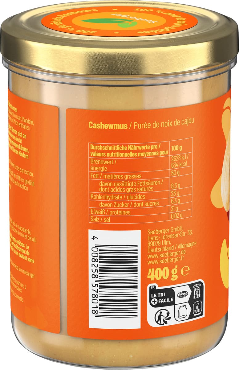 | Zutaten | Cashewkerne geröstet. Kann Spuren von Erdnüssen, Haselnüssen, Macadamianüssen, Mandeln, Paranüssen, Pekannüssen, Pistazien, Walnüssen und Milch enthalten. |