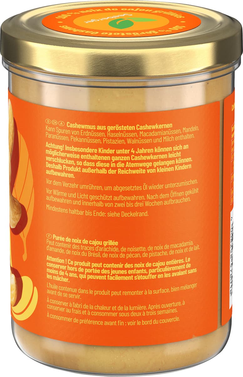 Achtung! Insbesondere Kinder unter 4 Jahren können sich an möglicherweise enthaltenen ganzen Cashewkernen leicht verschlucken, so dass diese in die Atemwege gelangen können. Deshalb Produkt außerhalb der Reichweite von kleinen Kindern aufbewahren.