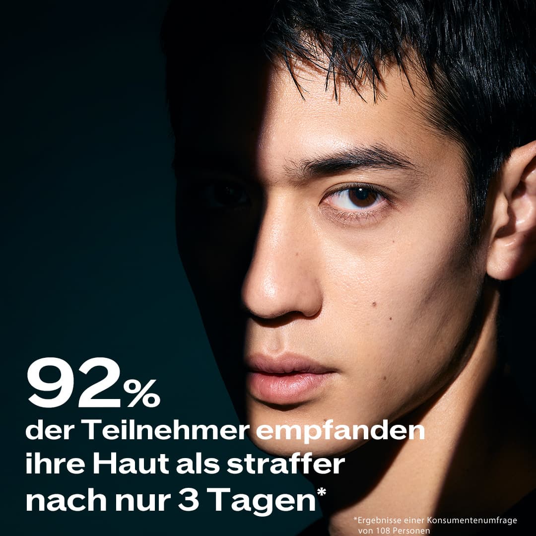 VERWANDELN SIE AGING IN POWER. 92% fanden, dass die Haut nach 3 Tagen straffer aussieht*. Unterstützt durch Peptid AA+. Dieses Serum mit Mehrfachwirkung reduziert verschiedene Probleme der Männerhaut (mangelnde Festigkeit, Falten, Mattigkeit, sichtbare Poren) in einem einzigen Schritt