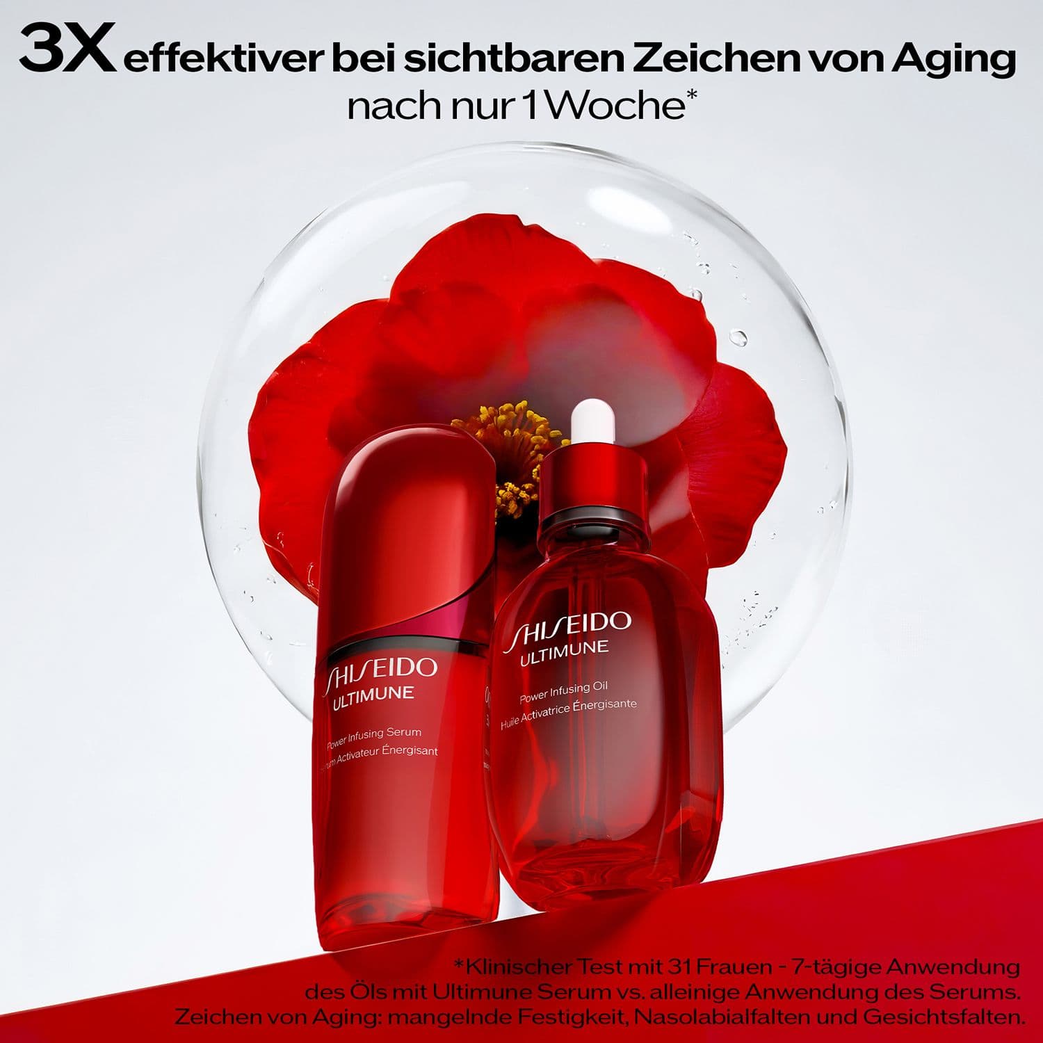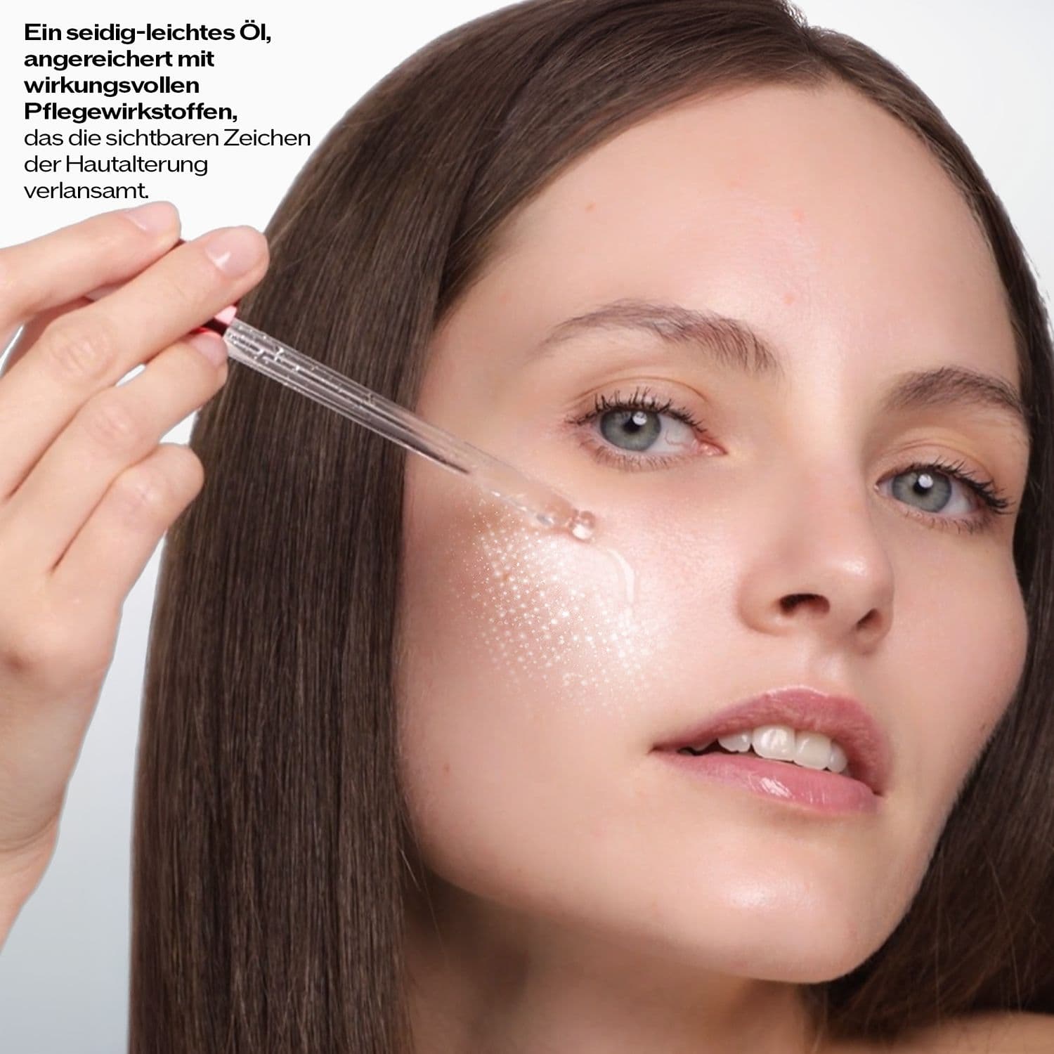 Ein seidig, leichtes Öl mit wirksamen Hautpflegewirkstoffen, das das Auftreten sichtbarer Zeichen der Hautalterung in jedem Alter verlangsamt. Für Gesicht, Körper und Haare.