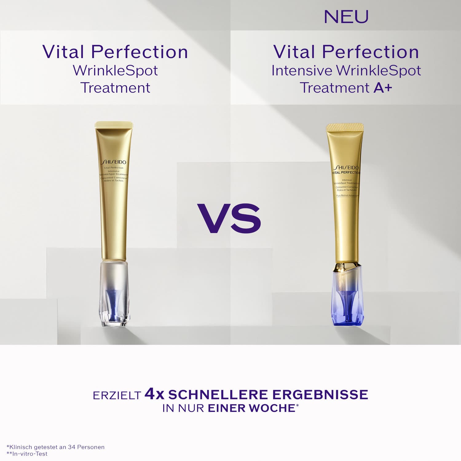 Shiseido präsentiert seine wirksamste gezielte Pflege, entwickelt für die speziellen Bedürfnisse reifer Haut. Dank Pure Retinol Advanced wirkt die innovative Formel effektiv gegen sichtbare Zeichen der Hautalterung: tiefe Falten, lichtbedingte Pigmentflecken und Elastizitätsverlust. Klinisch nachgewiesene Ergebnisse nach nur 7 Tagen*, mit fortlaufender Verbesserung über einen Zeitraum von bis zu 8 Wochen*. Als Teil der Vital Perfection Linie verkörpert das Intensive WrinkleSpot Treatment A+ Shiseidos wissenschaftliche Exzellenz für eine Haut, die sichtbar straffer, gefestigter und strahlender erscheint.