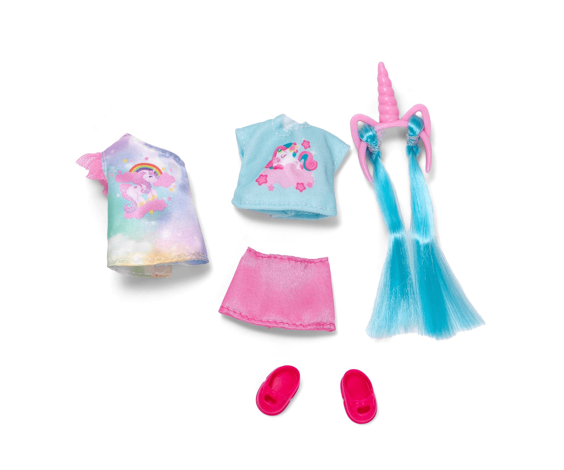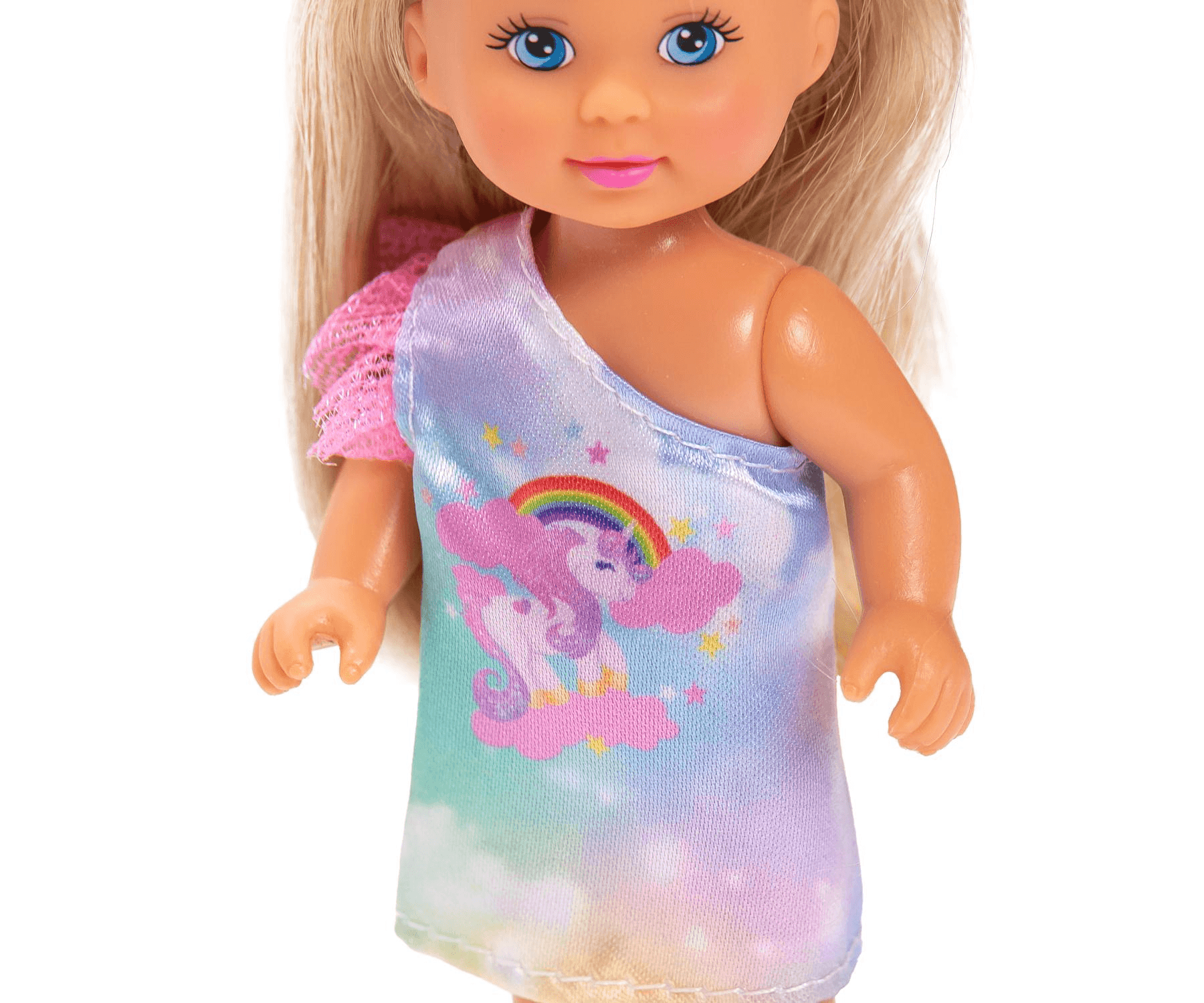 Die Evi LOVE Unicorn Fashion Puppe bringt magischen Spielspaß ins Kinderzimmer. Die 12 cm große Modepuppe trägt ein farbenfrohes Einhornkleid mit süßem Regenbogen-Motiv und tollen Details – perfekt für kleine Einhornfans. Mit dabei sind ein zusätzlicher Rock, ein passendes Shirt mit Einhorn-Aufdruck und ein Haarreif mit langen, bunten Strähnen, die Evis Frisuren ganz individuell verzaubern.