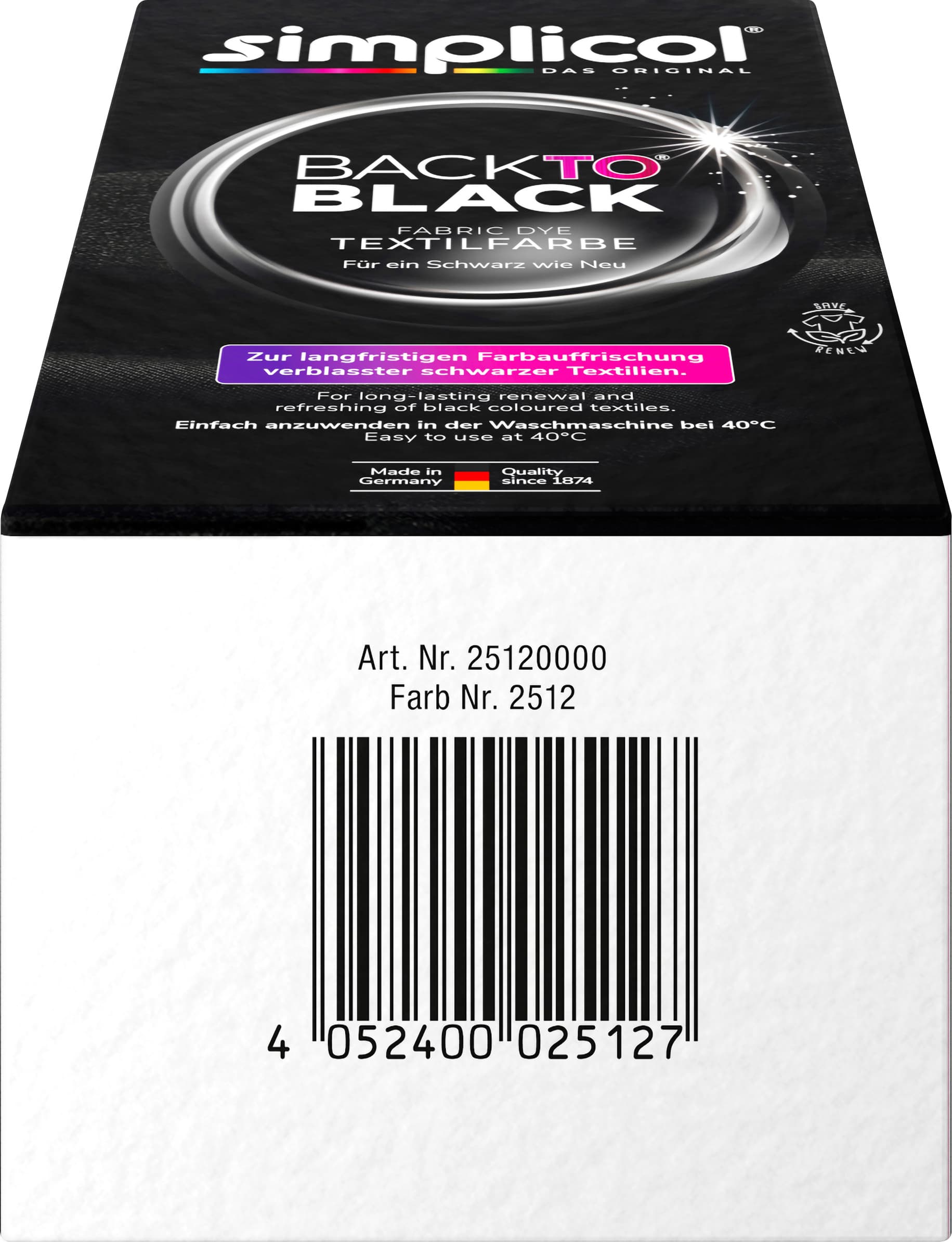 Zur Farberneuerung und -auffrischung schwarzer Textilien. Colour-repair Farb- und Fixierpulver.Ideal für Baumwolle, Viskose, Leinen und Mischgewebe.Eine Packung färbt ca. 600g Stoff dauerhaft schwarz. Beutelinhalt und Textilien einfach direkt in die Trommel geben und bei 40°C waschen.
