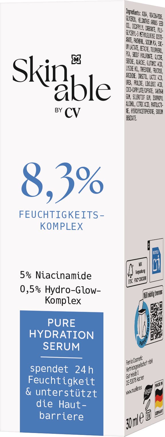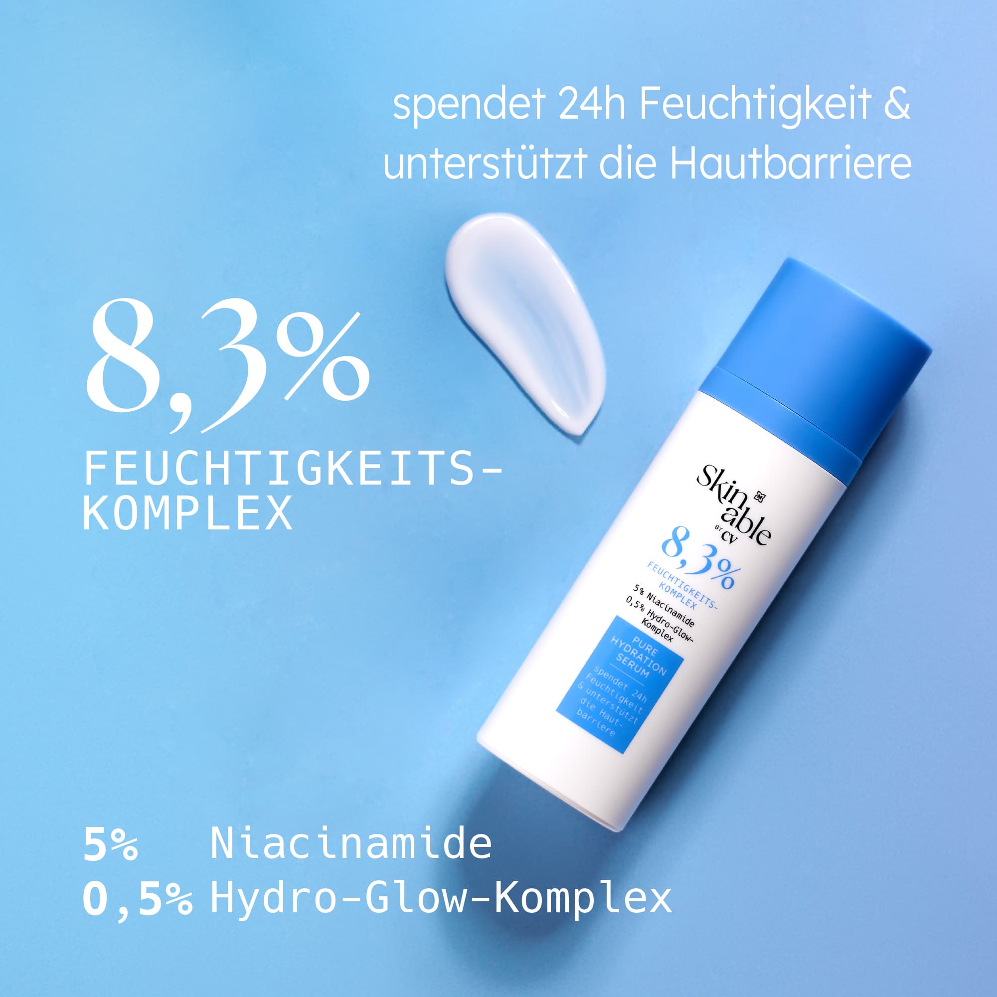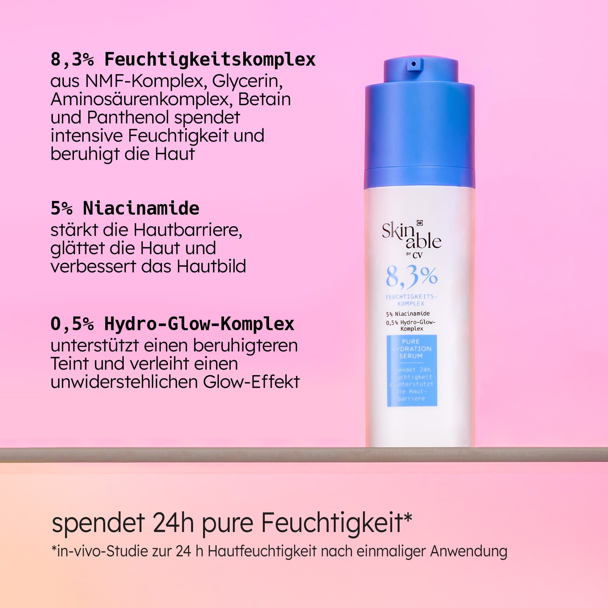 Das SKINABLE Pure Hydration Serumspendet 24 h pure Feuchtigkeit*, eine prallere, durchfeuchtete Haut und mehr Glow! Die erfrischende Hydro-Formel mit 8,3% Feuchtigkeitskomplex und 5% Niacinamide stärkt die Hautbarriere und hilft, die Widerstandskraft der Haut vor Umwelteinflüssen, Trockenheitsfältchen, Irritationen und Spannungsgefühlen zu unterstützen.