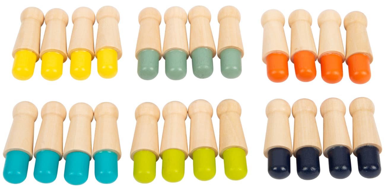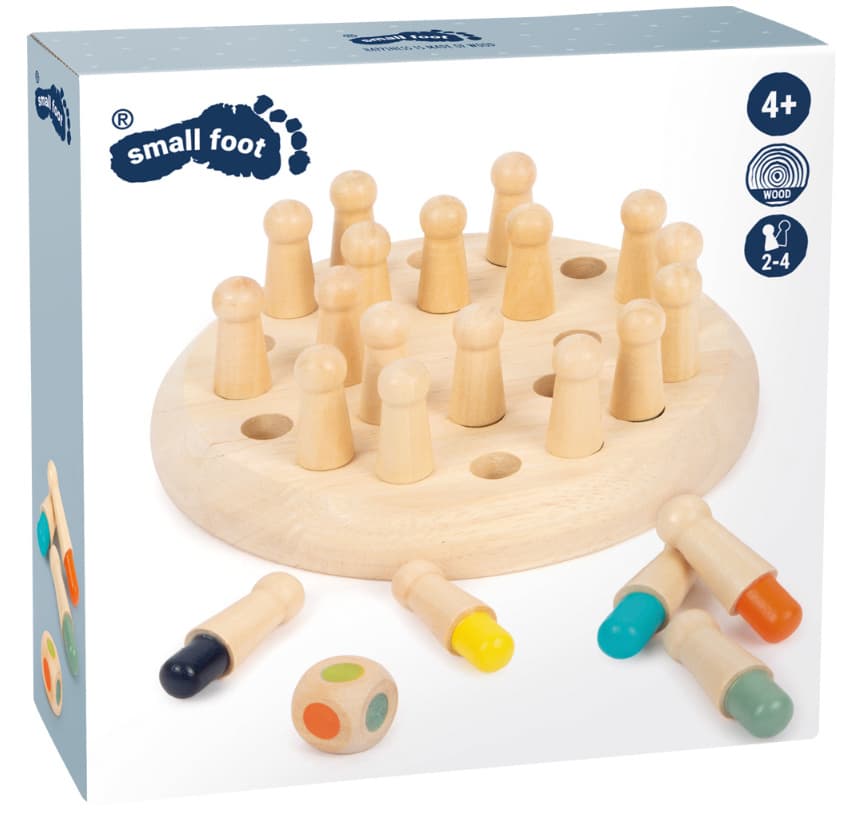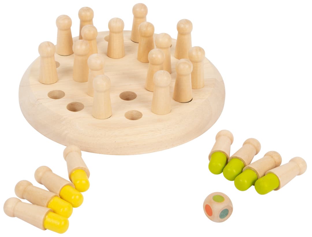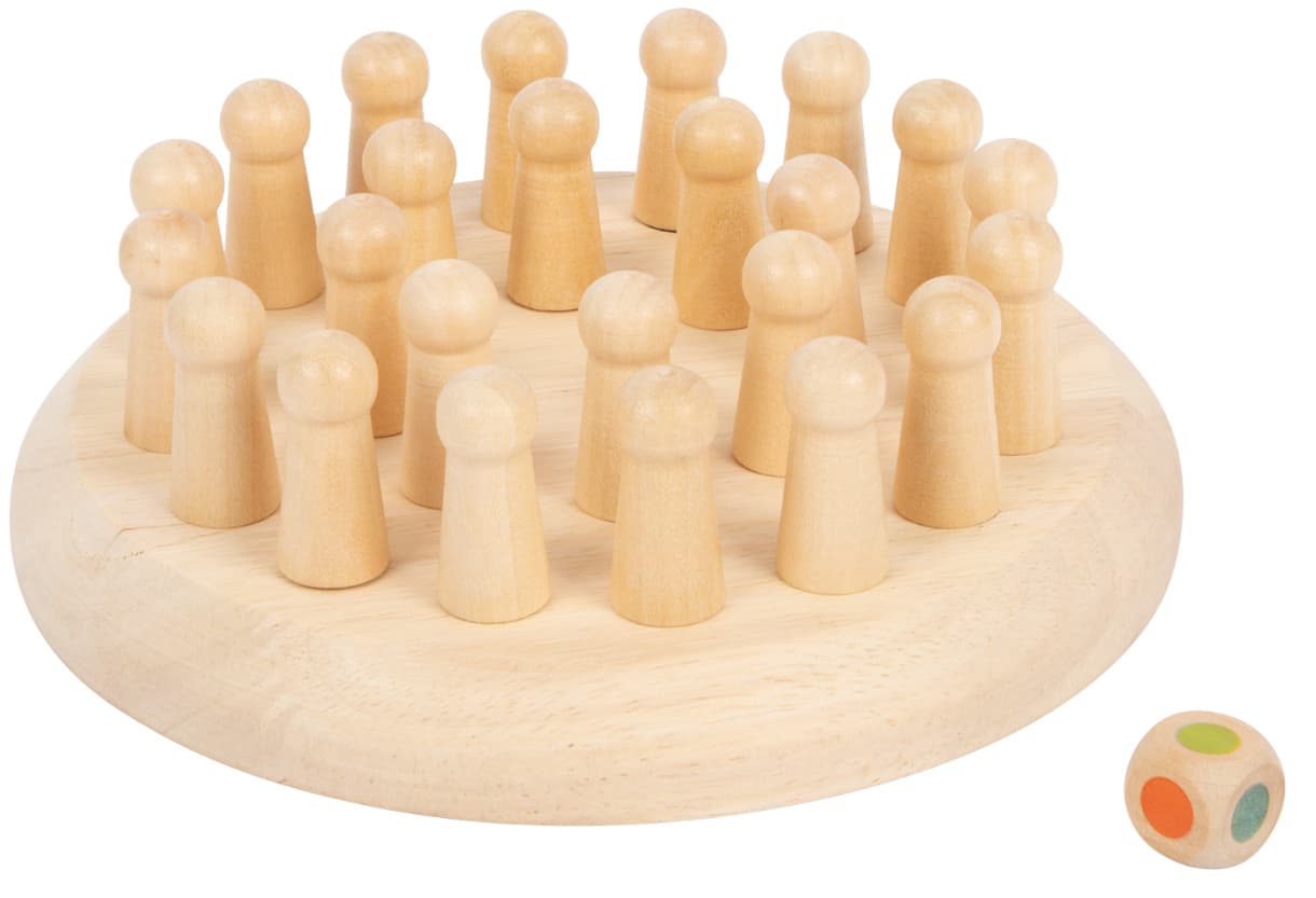 Beliebtes Lern- und Gedächtnisspiel mit 24 Spielfiguren- Auch ohne Würfel spielbar für geringere Schwierigkeit- Trainiert Farberkennung, Konzentration und Erinnerungsvermögen- Schult die feinmotorischen Fähigkeiten- Maße: Höhe ca. 5 cm, Ø ca. 17 cmSpielspaß mit Lerneffekt! Bei diesem beliebten Merk- und Gedächtnisspiel gilt es, gleiche Farben zu finden. Die farbigen Sockel der 24 Spielfiguren werden dabei in dem Steckspielfeld aus massivem, naturbelassenem Holz gut versteckt. Der Farbwürfel bestimmt, welche Farbe gefunden werden muss. Ein ansprechendes Memo-Spiel, das bereits kleineren Kindern viel Spaß bereitet und beim Stecken neben Farberkennung, Konzentration und Erinnerungsvermögen auch feinmotorische Fähigkeiten schult. Um den Schwierigkeitsgrad zu reduzieren auch ohne Würfel spielbar! Findet ein Spieler aus vier Figuren zwei Spielfiguren der gleichen Farbe, so darf er diese behalten. Derjenige Spieler, der am Ende die meisten Pärchen finden konnte, gewinnt das Spiel. Der hohe sichtbare Holzanteil und die massive Verarbeitung machen das Brettspiel zu einem echten Liebling im Spieleschrank und zur idealen Ergänzung zu Hör-Memo und Fühl-Memo, um die Sinnesentwicklung zu schulen!ALTERSEMPFEHLUNGab 4 JahreMATERIALHolz