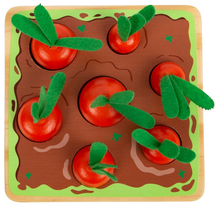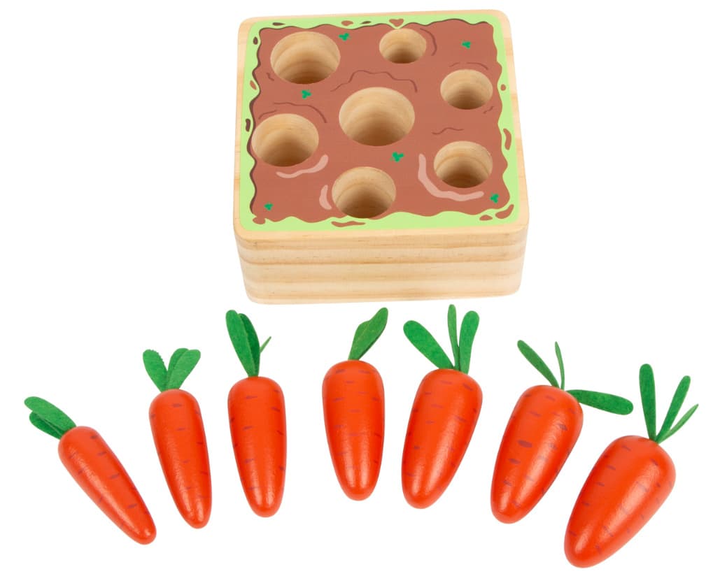 Die sieben Steck-Möhren in unterschiedlichen Größen müssen den passenden Löchern im"Beet"logisch zugeordnet werden- Durch gezieltes Vergleichen finden Kinder die richtige Zuordnung und erleben einen Lern- und Erfolgserlebnis- Das Sortierspiel schult feinmotorische Fähigkeiten, Wahrnehmung sowie Größenverständnis und -zuordnung- Ein von der Montessori-Pädagogik inspiriertes Lernspiel- Das Logikspiel kann ideal auch als Rollenspielzeug für Gemüsegärtner genutzt werdenMöhrenziehen mal anders! Dieses farbenfrohe, kindgerechte Steck- und Sortierspiel aus Holz folgt der Montessori Pädagogik und animiert Kinder dazu, selbständig zu vergleichen, zu sortieren, zu zählen und zu strukturieren. Denn es gilt, die sieben unterschiedlich großen Karotten den passenden Löchern im"Beet"zuzuordnen. Grüne Filzapplikationen geben den Möhren ein realitätsnahes Design und eignen sich auch ideal als Rollenspielzeug für kleine Gemüsegärtner.Bei dem durch die Montessori-Pädagogik inspirierten Sortierspiel trainieren Kinder ganz nebenbei feinmotorische Fähigkeiten, Wahrnehmung sowie Größenverständnis und -zuordnung.ALTERSEMPFEHLUNGab 12 MonateMATERIALHolzFilz