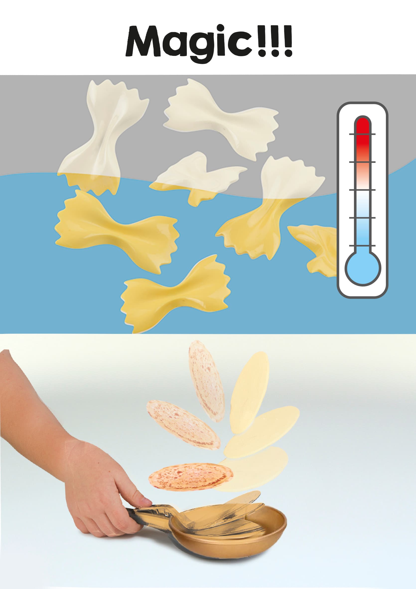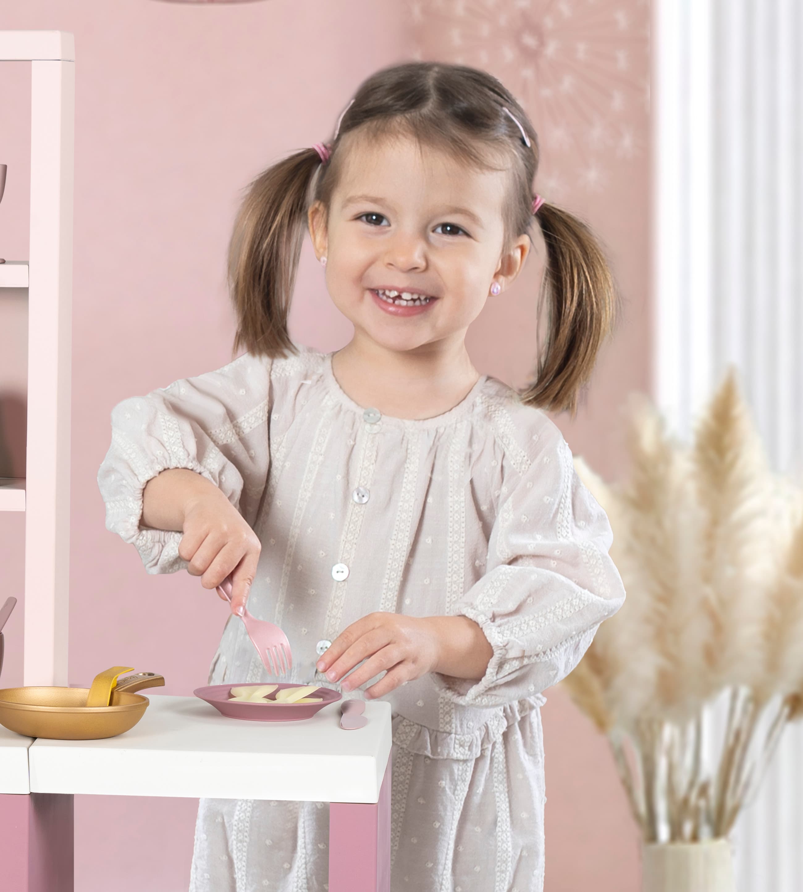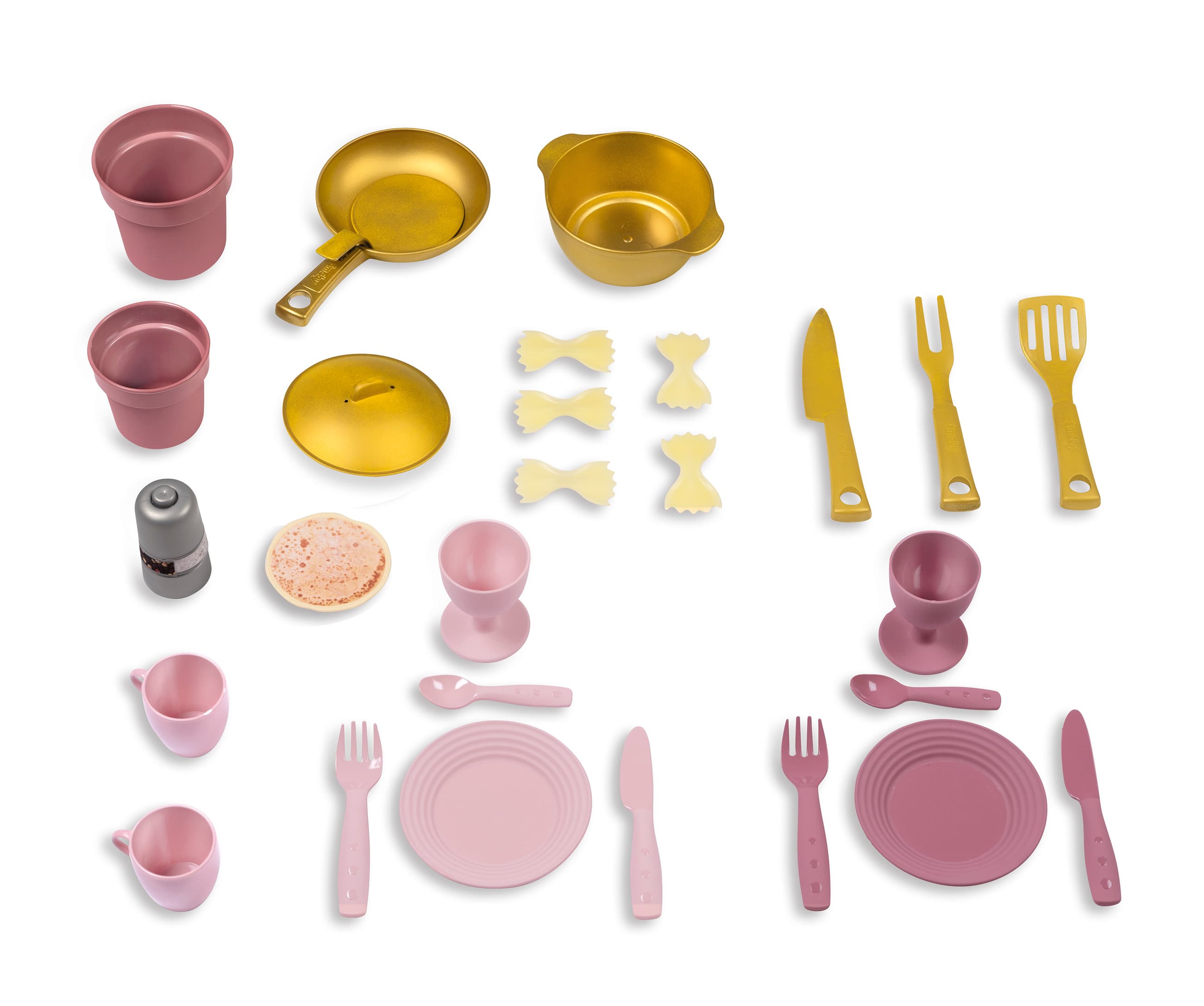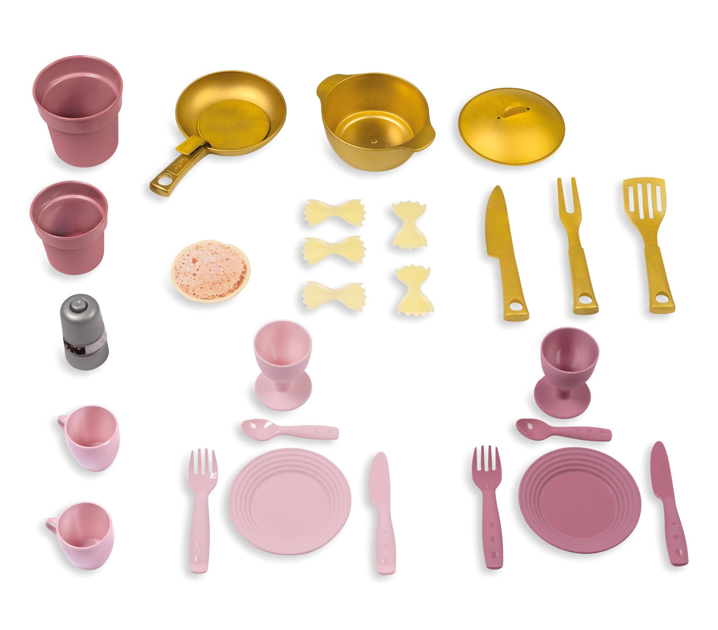 Mit 27 Zubehörteilen wird das Spiel noch abwechslungsreicher. Enthalten sind unter anderem Kochgeschirr, Besteck, Teller, Gläser, Tassen, eine Pfanne, ein Kochtopf mit Deckel, ein Pfannkuchen sowie ein Salz- und Pfefferstreuer mit Klickgeräusch und Behälter. Besonders beliebt: die magischen Nudeln, die ihre Farbe in kaltem Wasser verändern.