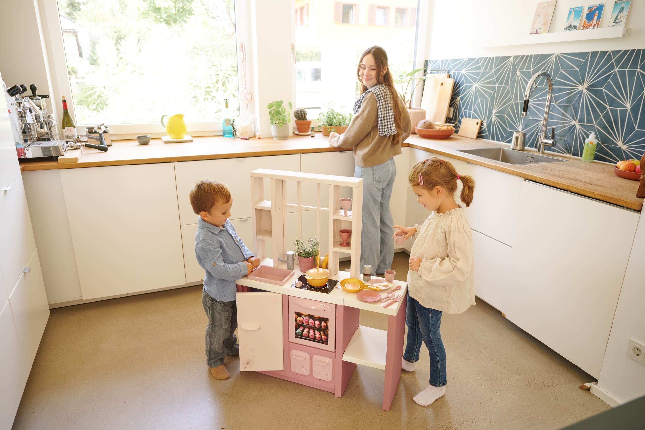 Die liebevoll gestaltete Spielküche bietet ausreichend Platz, um Freunde und Geschwister zum gemeinsamen Spielen einzuladen. Dabei ist die Arbeitsfläche mit ihrer kindgerechten Höhe von 50 cm ideal für Kinder ab 3 Jahren.