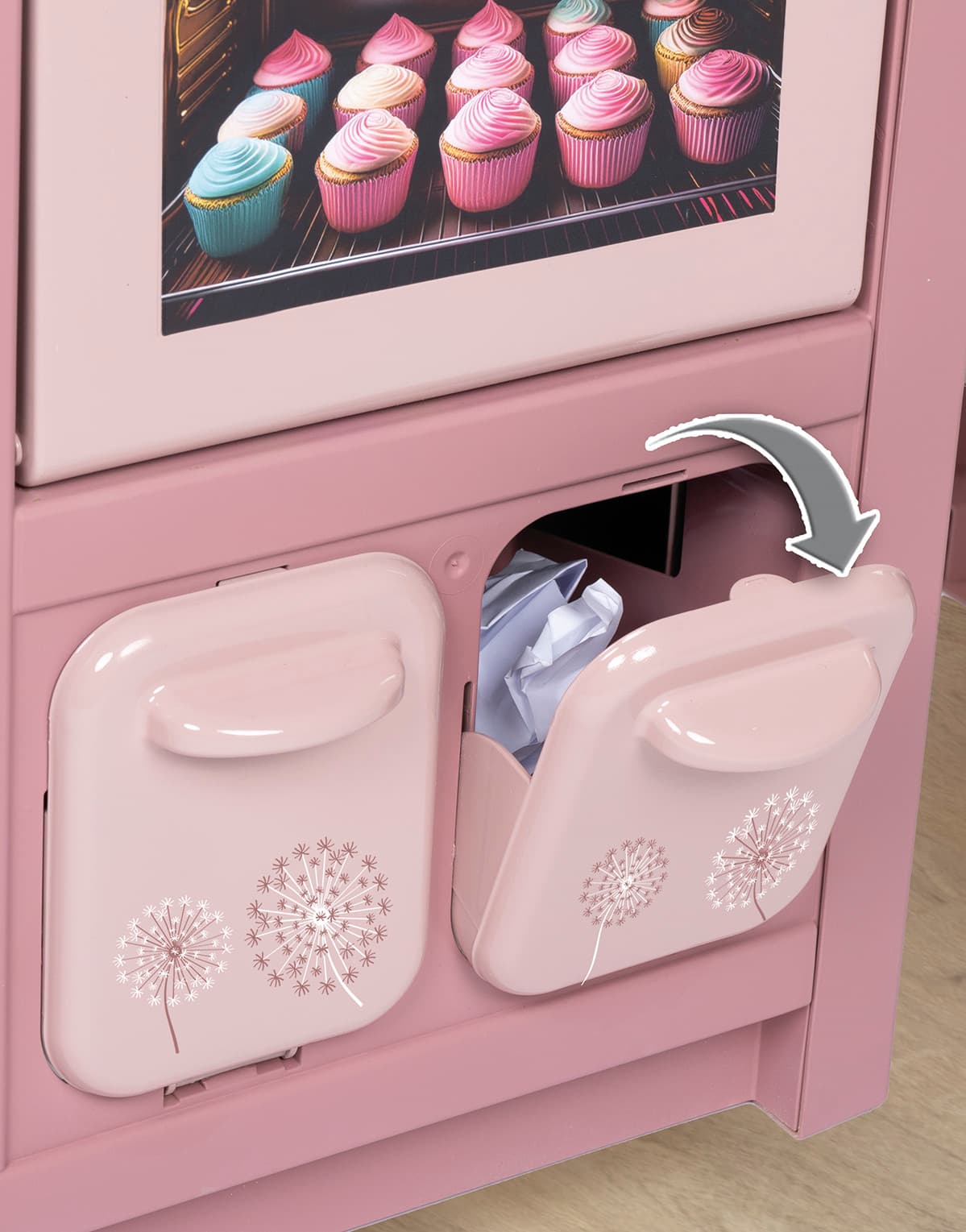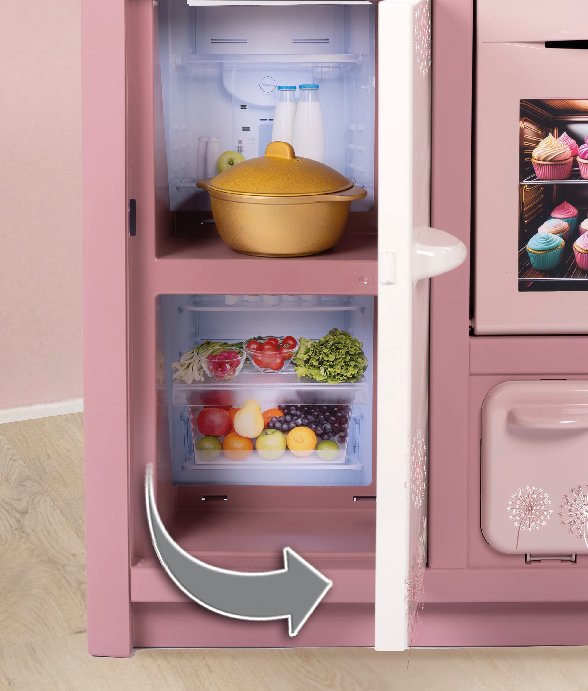 Ausgestattet ist die Kinderküche mit allem, was eine moderne Küche ausmacht: einem Kochfeld mit elektronischem Soundmodul, einem großen Ofen, einem Kühlschrank, einer Spüle sowie zahlreichen Ablageflächen.