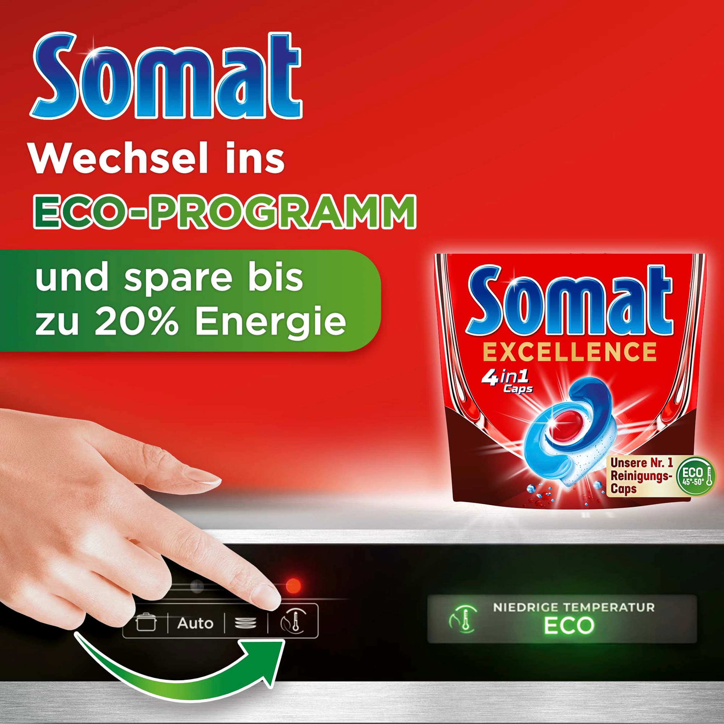 Wie wäre es, das Geschirr zu waschen und dabei die Spülmaschine optimal zu pflegen? Die 4in1 Excellence Geschirrspültabs leiten eine neue Somat Generation ein. Dank der vierfachen Wirkung wird nicht nur das Geschirr strahlend sauber, sondern gleichzeitig die Spülmaschine vor Verkalkung geschützt. Sobald die vier Kammern zum Einsatz kommen wird ihre volle Kraft offenbart. Gläser werden mit einem brillanten Glanz überzogen und Eingebranntes wird durch die tiefenwirksame Reinigung einfach abgespült. Doch auch empfindliches Geschirr wird geschützt und die Spülmaschinenpflege dringt tief ins Innere des Geschirrspülers ein. Mit den Somat Caps bleibt kein Fleck wo er war und das Geschirr kommt strahlend sauber aus der Spülmaschine.