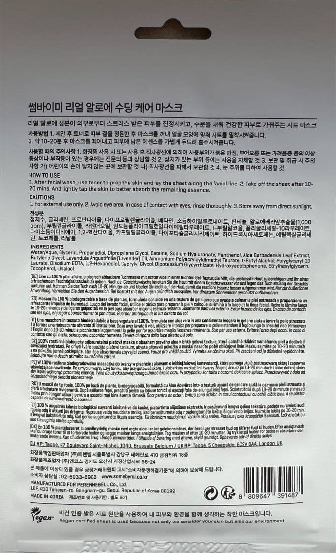 SOMEBYMI Real Care Masken aus 100% veganen, pflanzlichen, abbaubaren Cellulosefasern pflegen die Haut und versorgen jedes Hautbedürfnis mit puren, echten Inhaltsstoffen! Die Tuchmasken sind frei von künstlichem Parfüm, Parabenen, Sulfaten, austrocknendem Alkohol und Silikonen. Winzige Hohlräume im Tuch speichern extra viel wertvolle Essence und können auch tiefe Hautschichten optimal versorgen. Die Tuchmaske mit einer doppelten Dosis Aloe nährt und tonisiert perfekt. Mit antibakteriellen Eigenschaften beugt sie Unreinheiten vor und erfrischt die Haut. Der hohe Gehalt an Beta-Glucan steigert die Hautfeuchtigkeit und verbessert die Elastizität. Diese Komponente wirkt aktiv bei der Behandlung von Irritationen und Rötungen.