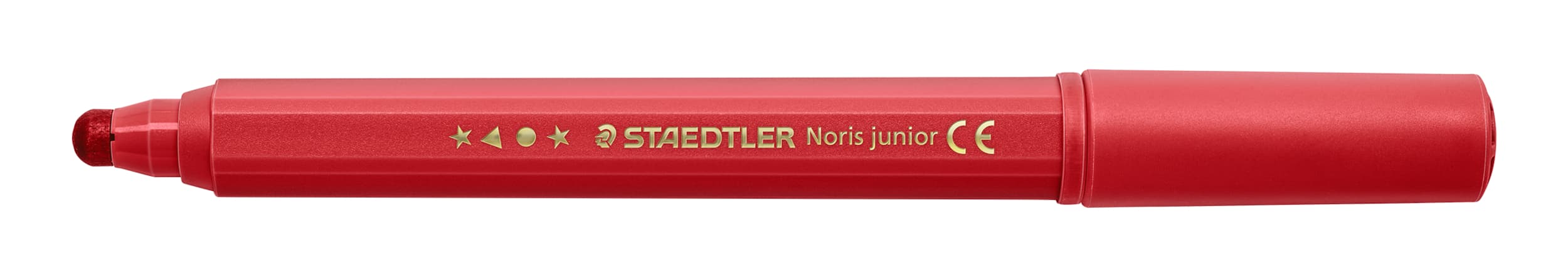 STAEDTLER Noris junior Fasermaler, für Kinder ab 2 Jahren, Kindergarten, Schule und Familie. Etui mit 6 Fasermalern. dicker hexagonaler Schaft. Runde stabile und eindrücksichere Faserspitze. Tinte auf Wasserbasis, aus den meisten Textilien leicht auswaschbar, dermatologisch getestet. 6 Farben sortiert. CE konform. "2+" geeignet für Kinder ab 2 Jahren.