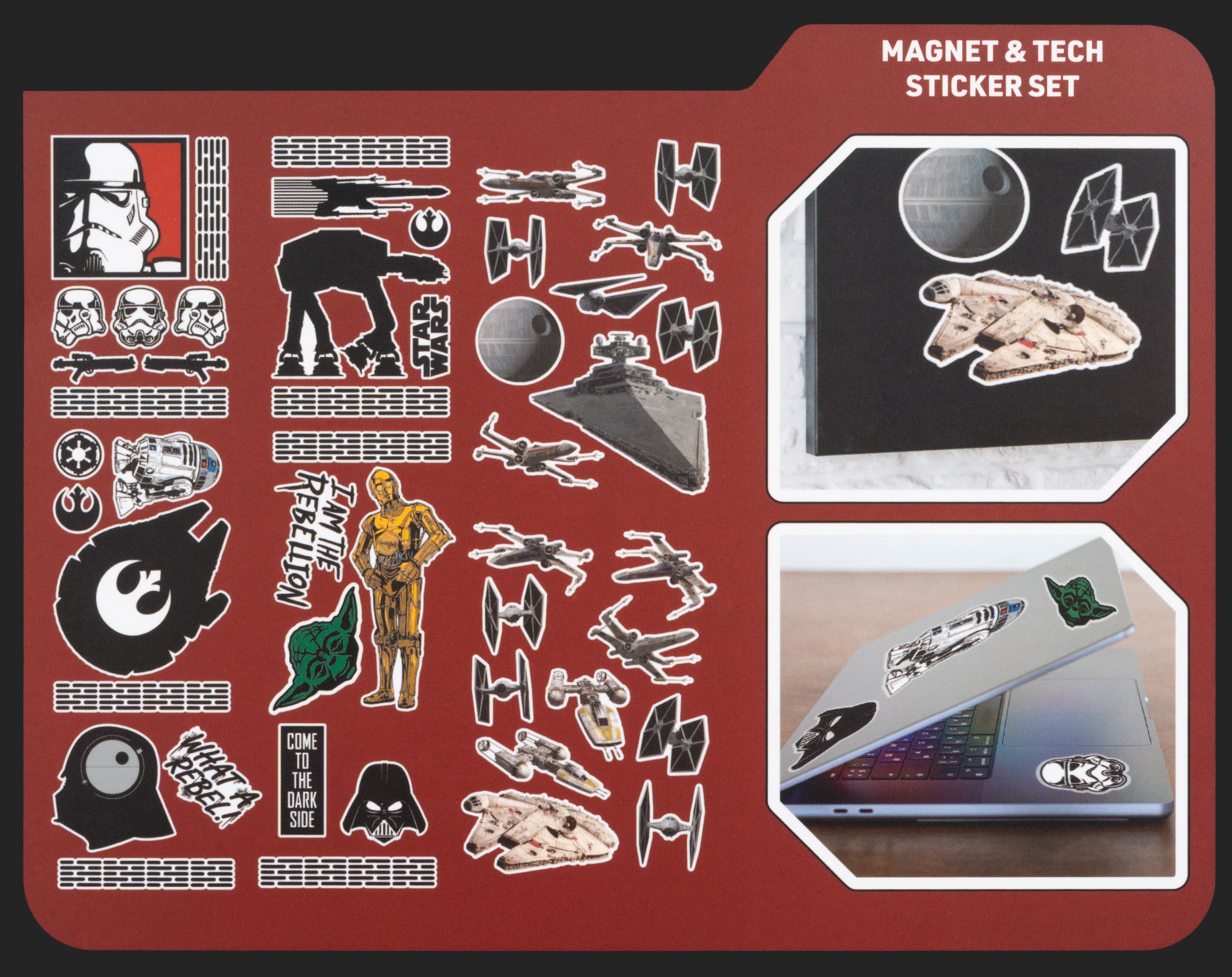 Tauche ein in die faszinierende Galaxis von Star Wars! Dieses vielseitige Set enthält 20 hochwertige Magnete und 30 Sticker mit beliebten Motiven aus
