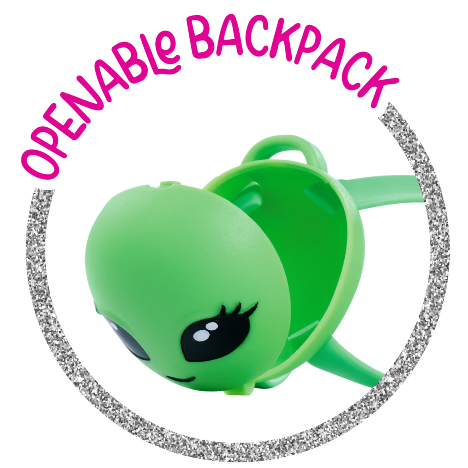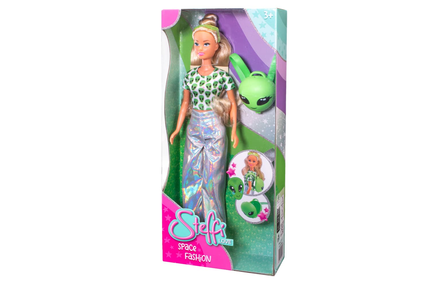 Steffi trägt ein trendiges T-Shirt mit einem grünen Alien Muster und dazu eine silber, glänzende, holografische HoseSteffi hat langes, blondes, welliges Haar. Als Accessoire hat sie einen Rucksack, der geöffnet werden kann, im Alien Style und ein Haarband.